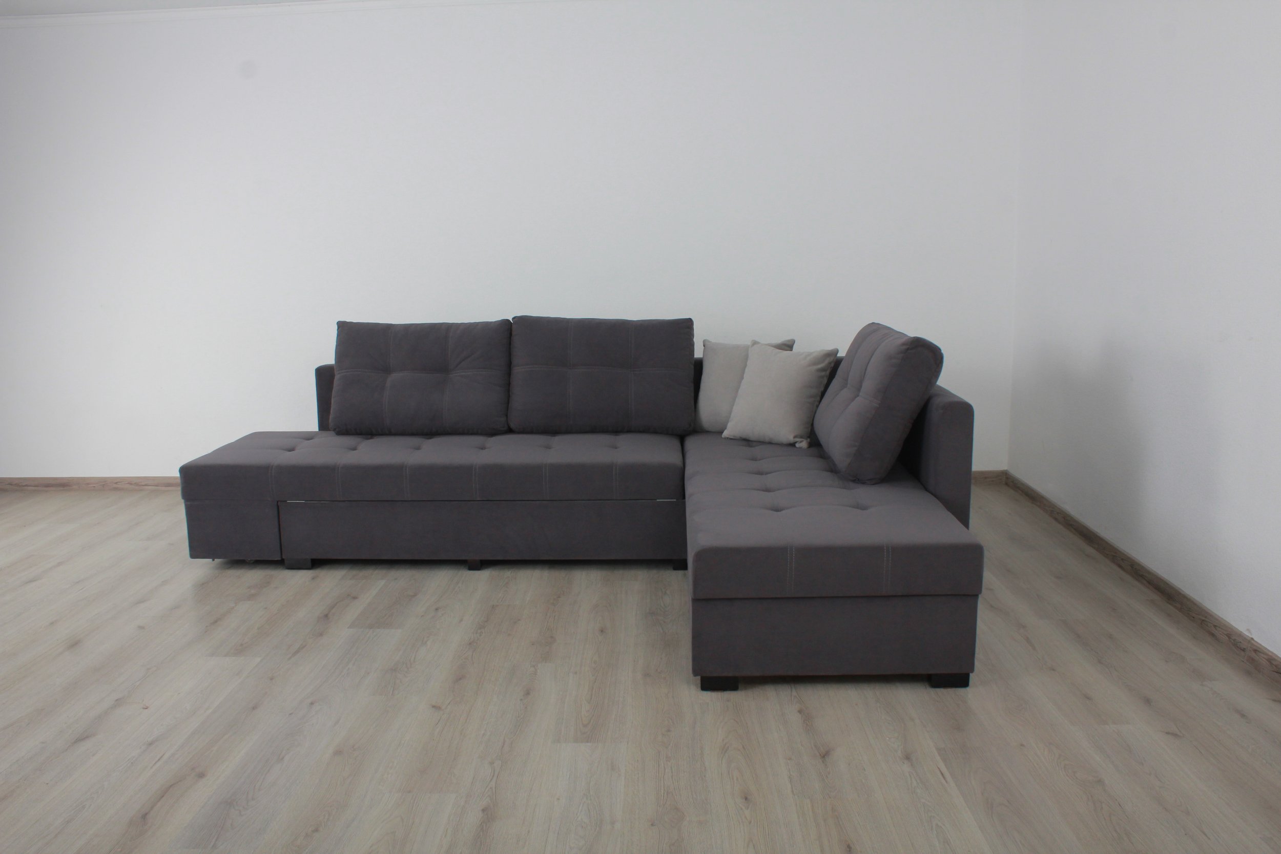 - Плюсы прямого дивана: нет стыка на спальном месте, занимает меньше места в комнате и лучше подходит для малых и средних комнат, а также приятная цена.