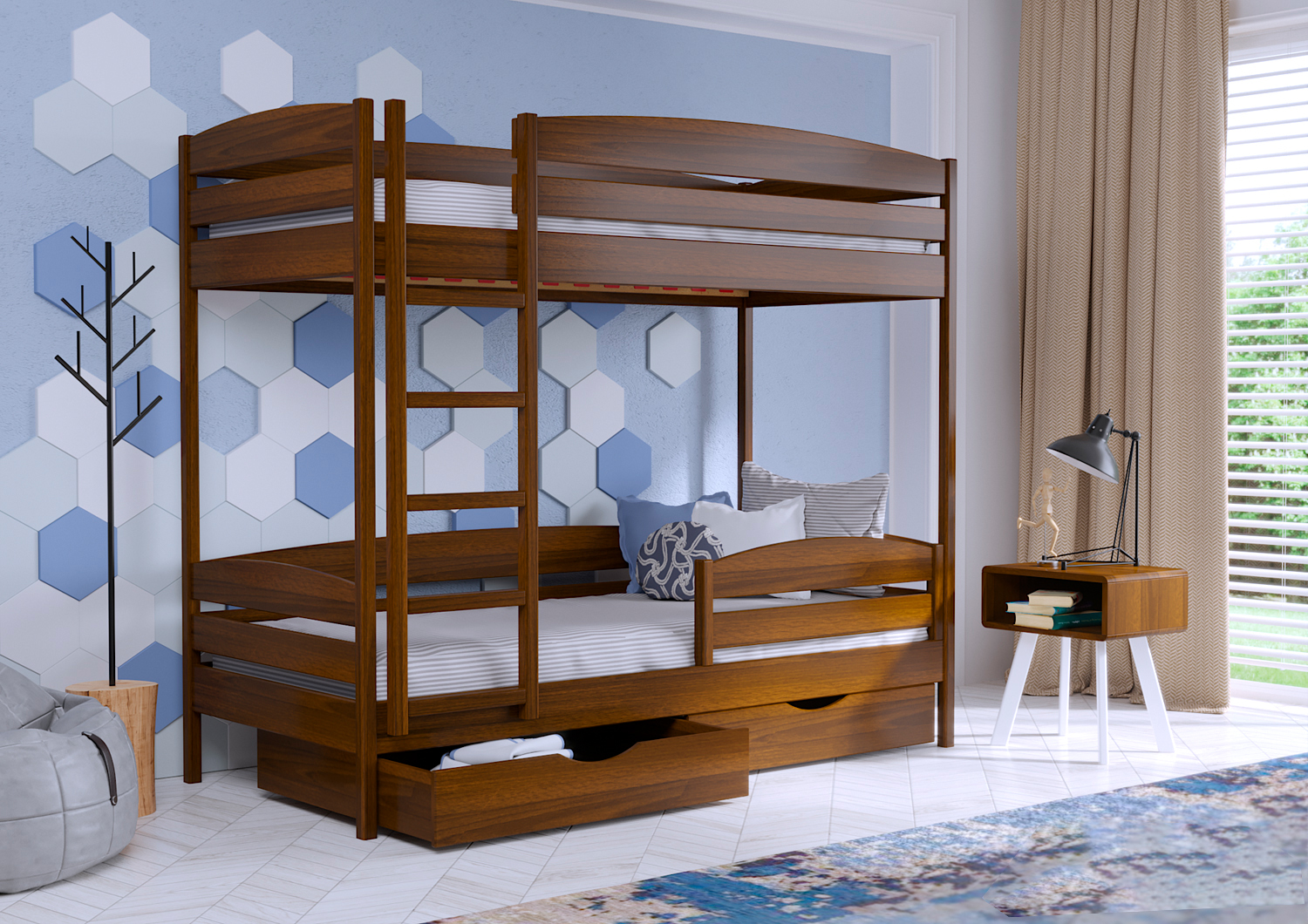 Двухъярусная кровать Дует Плюс из серии Тесса — это функциональное и стильное решение для современной детской или подростковой комнаты. Модель разработана с акцентом на безопасность, комфорт и эффективное использование пространства. Два полноценные спальных места позволяют разместить двоих детей или организовать удобное дополнительное место для гостей. Сдержанный дизайн в сочетании с высококачественными материалами делает Дует Плюс не только практичным, но и эстетически привлекательным элементом интерьера. Прочная деревянная конструкция гарантирует долговечность, а лестница и бортики верхнего яруса обеспечивают безопасное использование. Кровать также имеет вместительные выдвижные ящики для хранения постельного белья, игрушек или одежды, что позволяет поддерживать порядок в комнате без дополнительных мебельных предметов. Дует Плюс / Серия Тесса — это идеальное сочетание стиля, эргономики и удобства для семей, которые ценят практичные и долговечные решения.