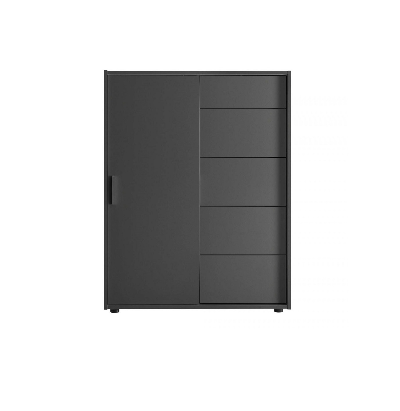 Корпус и фасады выполнены из качественной ДСП, что обеспечивает стабильность конструкции и износостойкость при ежедневной эксплуатации. Пять ящиков оснащены трёхсоставными телескопическими направляющими шарикового типа полного выдвижения повышенной прочности, что гарантирует плавный ход и надёжную работу механизмов. Раздвижная система дверцы позволяет рационально использовать пространство и сохранять лаконичный вид фасада. Ручки изготовлены из пластика с хромированным матовым покрытием, подчёркивающим современную стилистику изделия. Модель представлена в цвете Графит серый — глубоком насыщенном оттенке, который гармонично вписывается в интерьеры в стиле модерн и лофт. В комплект входит дополнительная фурнитура для крепления комода к стене. Комплектуется инструкцией и полным набором фурнитуры для монтажа.