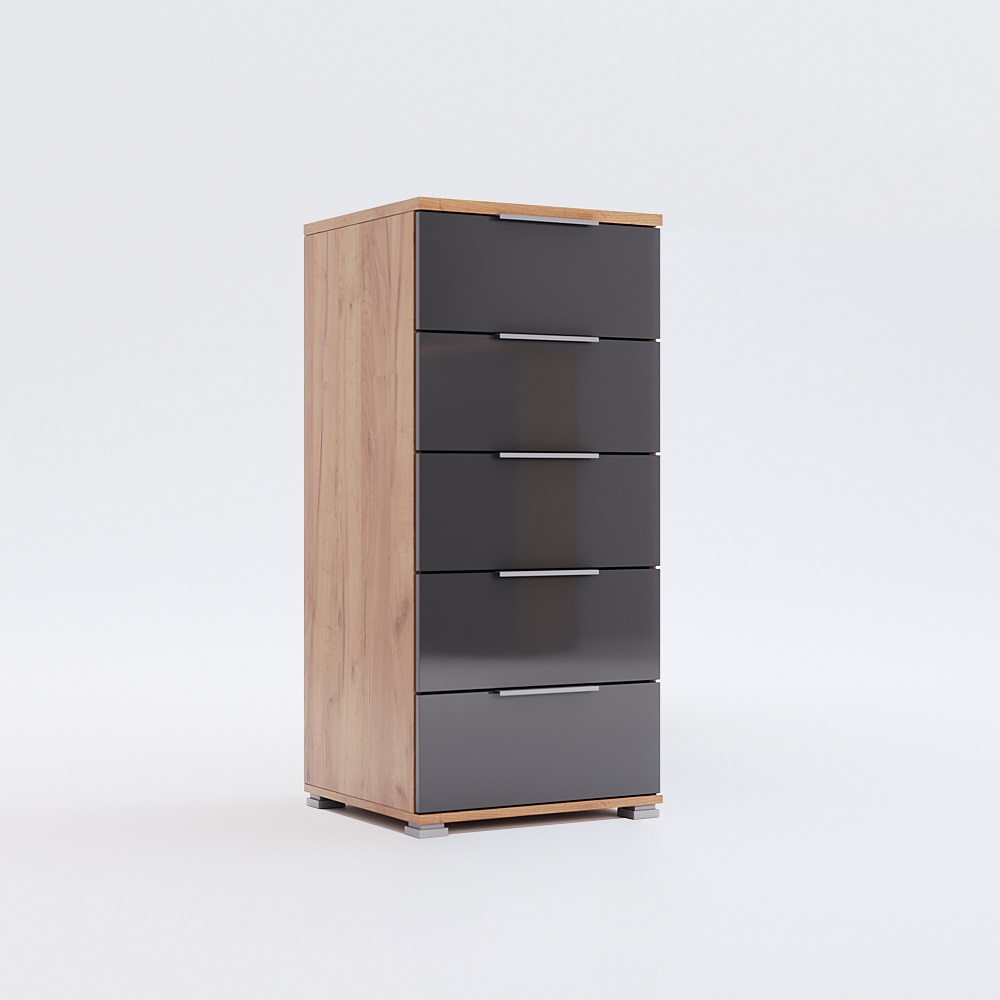 Корпус модели выполнен из надёжной ДСП в цвете Дуб крафт, что придаёт интерьеру природную текстуру и теплоту. Фасады из ДСП в оттенке Мат лава имеют многослойное лаковое покрытие, высушенное под ультрафиолетовыми лучами, что обеспечивает глубину цвета и устойчивость к ежедневной нагрузке. Пять выдвижных ящиков оснащены прочными телескопическими направляющими полного выдвижения повышенной надёжности, что гарантирует плавный ход и долговечность механизмов. Ручки изготовлены из пластика с матовым хромированным покрытием, а квадратные ножки подчёркивают чёткость линий и придают конструкции современную лёгкость. Комод продуман для устойчивости и комфортного использования даже при полной загрузке ящиков. Комплектуется инструкцией и полным набором фурнитуры для монтажа.