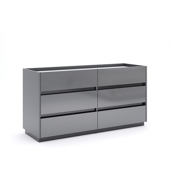 Корпус, фасады и верхняя крышка изготовлены из прочной ДСП толщиной 16 мм в цветах Мат антрацит и Мат графит, создающих современный контраст и глубину оттенков. Фасады и крышка имеют многослойное лакированное покрытие, высушенное под ультрафиолетовыми лучами, благодаря чему поверхность устойчива к износу и сохраняет насыщенность цвета. Кромка корпуса и фасадов выполнена из ПВХ 0,5 мм с меламиновым покрытием на невидимых сторонах, что обеспечивает аккуратную обработку. Шесть ящиков работают на телескопических направляющих повышенной прочности с полным выдвижением, гарантируя плавность и долговечность механизмов. Утопленная крышка интегрирована в корпус как функциональный элемент для безопасного размещения декора. Комплектуется инструкцией и полным набором фурнитуры для монтажа.