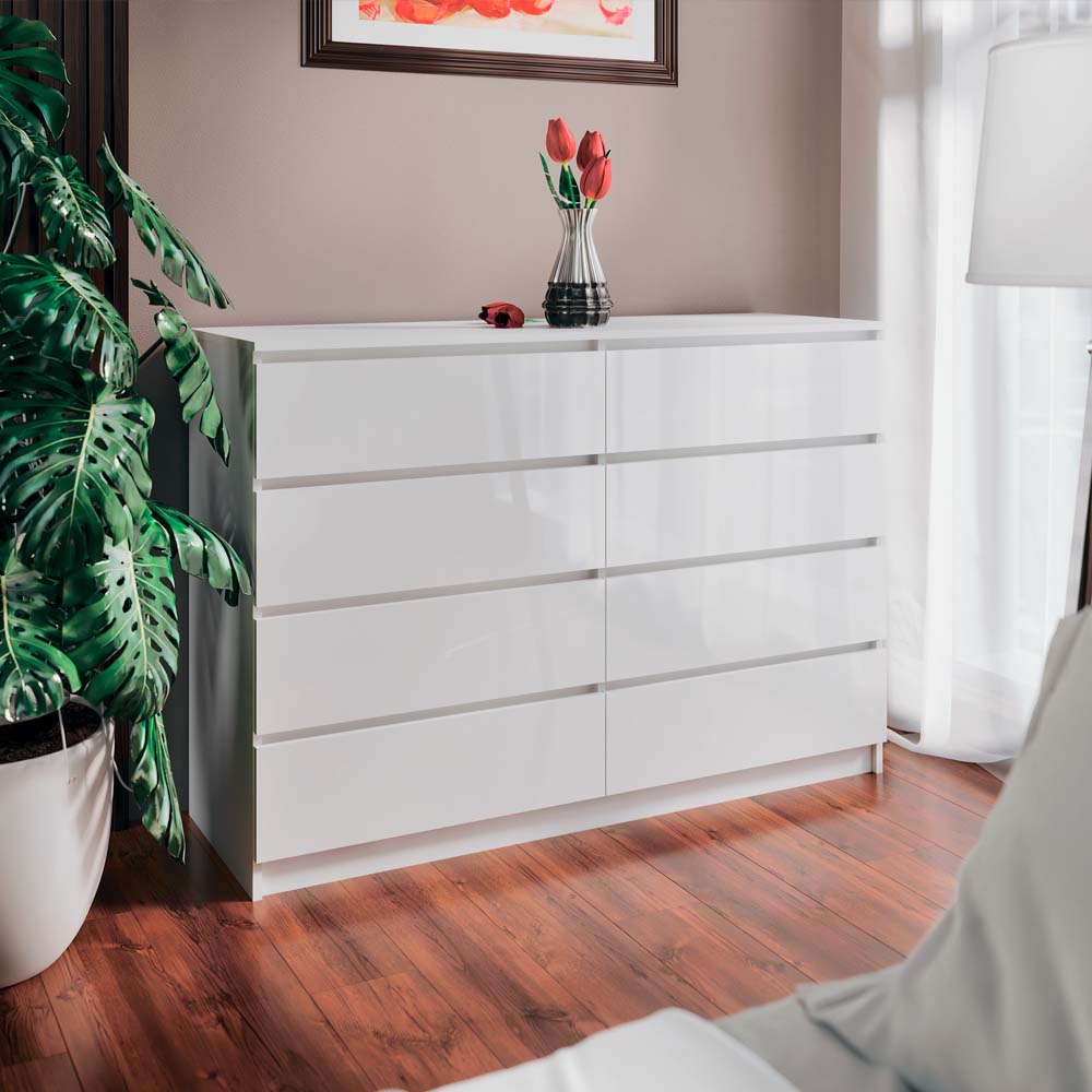 Комод изготовлен из сочетания надежных материалов: корпус выполнен из ламинированной ДСП, которая устойчива к износу, царапинам и воздействию влаги, а фасады из МДФ обеспечивают прочность, эстетичный внешний вид и долговечность. Восемь выдвижных ящиков оснащены телескопическими направляющими, что гарантирует плавный, тихий и комфортный ход. Система push to open позволяет открывать ящики без ручек, сохраняя чистоту дизайна. Комод поставляется в разобранном виде со всеми необходимыми комплектующими и инструкцией по сборке.