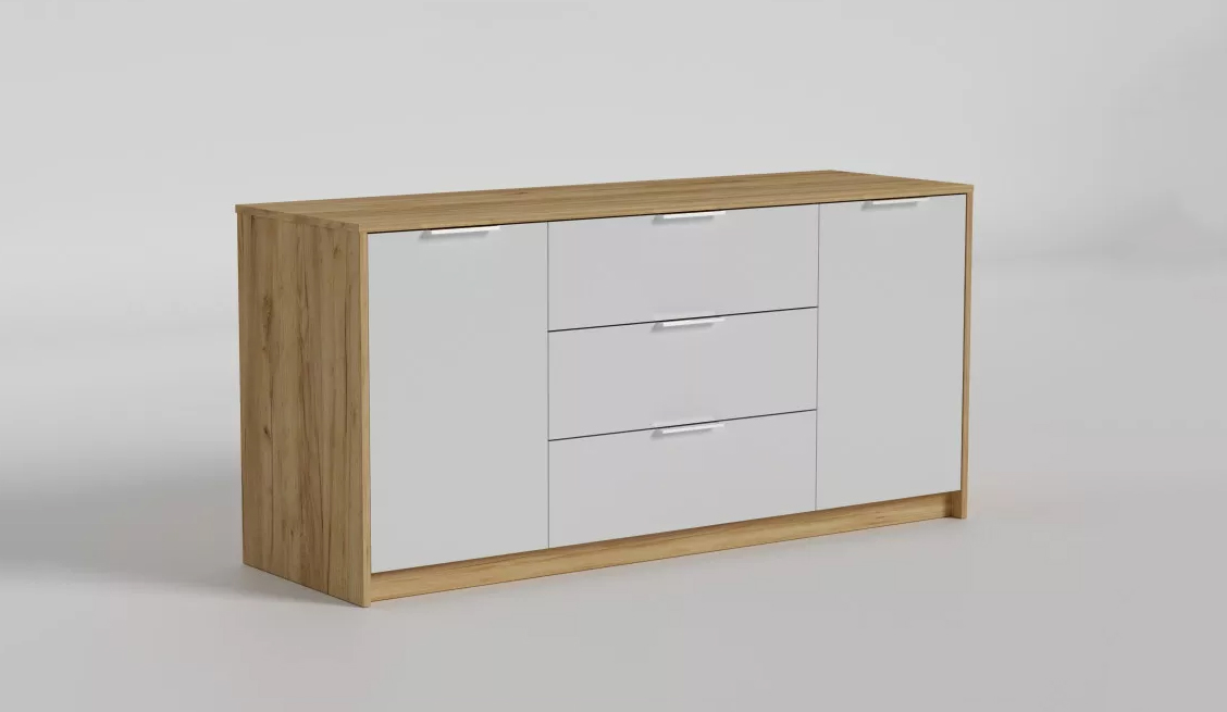 Комод изготовлен из ламинированной ДСП класса Е1 для корпуса и фасадов, что обеспечивает стабильность конструкции, износостойкость и аккуратный внешний вид в процессе эксплуатации. Поверхности легко очищаются и сохраняют опрятность даже при активном использовании. Модель представлена в нескольких цветовых сочетаниях: Белый диамант, Орех лион светлый, Дуб урбан ойстер, Дуб экспрессив бронзовый, Бароко ристретто, Бароко бурштиновый, Антрацит, Дуб сонома, Дуб крафт золотой, Дуб сонома трюфель, Дуб крафт белый, Венге магия, Белое дерево, что позволяет подобрать вариант под современную гостиную со светлой или более контрастной палитрой. Центральные ящики оснащены телескопическими направляющими с доводчиками для плавного и тихого хода, а закрытые секции с полками подходят для хранения более габаритных вещей без визуального шума. Металлические профильные ручки из металла добавляют модели выразительности и подчёркивают её современный характер. Комплектуется инструкцией и полным набором фурнитуры для монтажа.