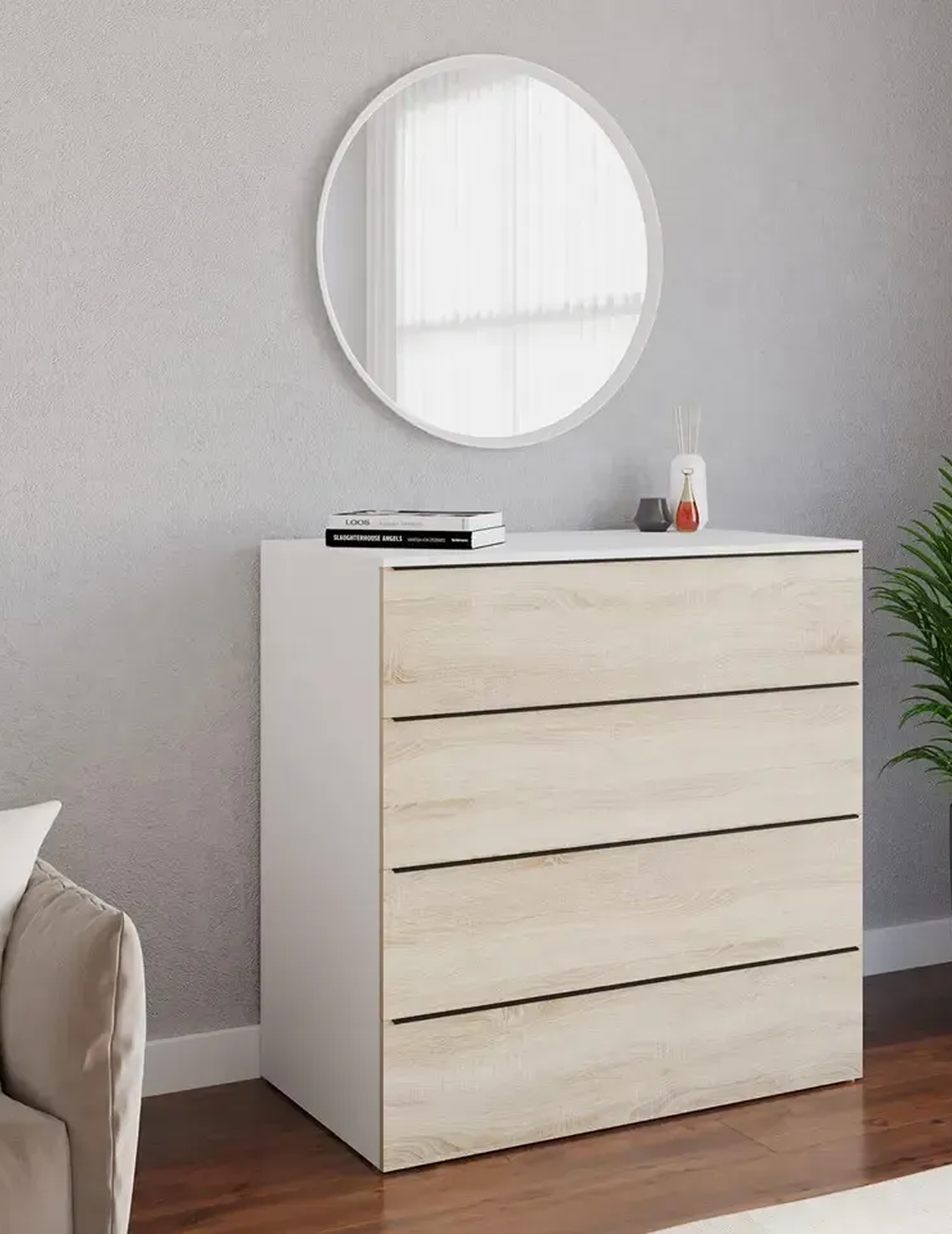 Комод ТХ005 Белый / Дуб сонома Морели — это гармоничное сочетание света и натуральной текстуры, создающее в гостиной атмосферу спокойствия и упорядоченности. Светлый корпус в цвете Белый придаёт пространству лёгкость, а фасады в оттенке Дуб сонома добавляют тёплый древесный акцент, делая интерьер более уютным. Благодаря чётким геометрическим пропорциям модель выглядит современно и аккуратно, не перегружая пространство лишними деталями. Вертикальный формат позволяет рационально организовать хранение, сохраняя баланс между функциональностью и эстетикой. Отсутствие ручек подчёркивает минималистичный характер комода и поддерживает целостность фасадов.