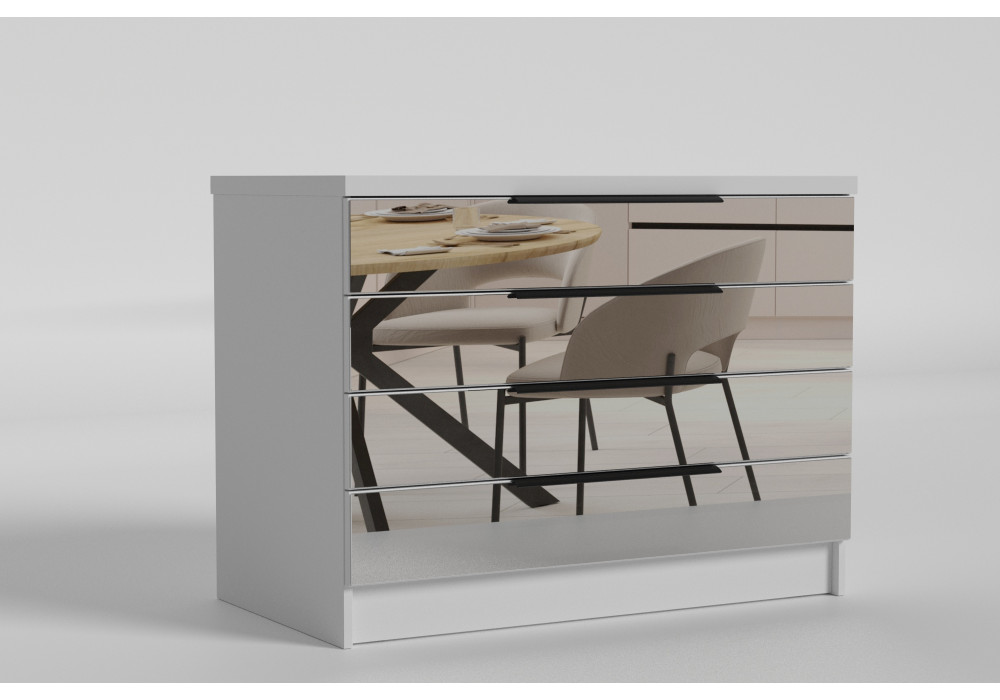 Комод изготовлен из ламинированной ДСП, которая используется для корпуса и обеспечивает прочность конструкции и стабильность при ежедневной эксплуатации. Фасады сочетают ДСП и зеркало, создавая выразительный декоративный эффект и добавляя интерьеру глубины и света. Зеркальные вставки доступны в вариантах графит, бронза и серебро, что позволяет подобрать оптимальное настроение для пространства. Модель изготавливается в таких вариантах цветов: Белая аляска, Дуб экспрессив бронзовый, Антрацит, Дуб сонома светлый, Дуб крафт белый, Дуб крафт золотой, Белое дерево, Дуб барокко ристретто, Дуб барокко бурштиновый, Морское дерево карбон, Серая глина, Дуб кремона канноло. Кромка толщиной 2 мм обладает противоударными свойствами, а усиленная крышка 32 мм повышает общую надёжность конструкции. Выдвижные ящики оснащены телескопическими направляющими с доводчиками, которые обеспечивают плавный и тихий ход. Комплектуется инструкцией и полным набором фурнитуры для монтажа.