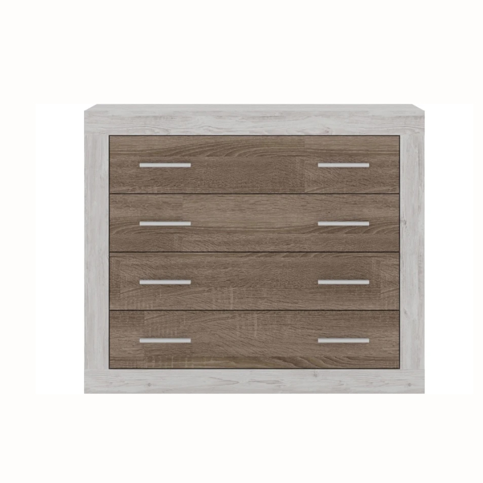 Комод изготовлен из ламинированной ДСП, что обеспечивает прочность конструкции и устойчивость к ежедневному использованию. Сочетание цветов Сосна каньйон/Дуб сонома трюфель создает гармоничный контраст и добавляет интерьеру стиля и тепла одновременно. Поверхности легко очищаются и хорошо выдерживают повседневные нагрузки. Конструкция предусматривает четыре вместительных ящиков, которые позволяют удобно организовать хранение одежды, белья или других вещей. Ящики оснащены роликовыми направляющими, что обеспечивает плавный ход и комфорт в использовании. Пластиковые ручки имеют удобную форму, практичны в уходе и гармонично дополняют внешний вид модели. Комплектуется инструкцией и полным набором фурнитуры для монтажа.
