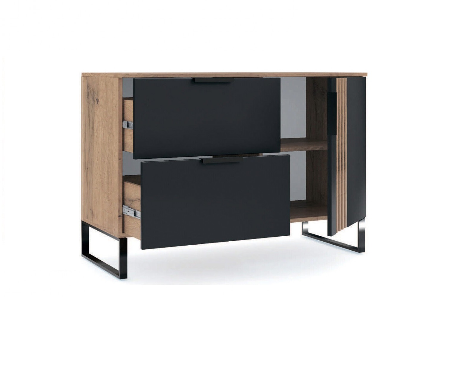 - Удобная организация пространства. Комод имеет одну закрытую секции с полками и два вместительные ящика, что позволяет аккуратно хранить вещи и поддерживать порядок.