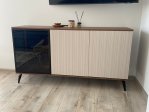 Современный дизайн без ручек. Система рush-to-оpen обеспечивает открывание легким нажатием и поддерживает минималистичный вид фасадов. Витринный элемент из темного закаленного стекла придает элегантность и делает комод стильным интерьерным акцентом.