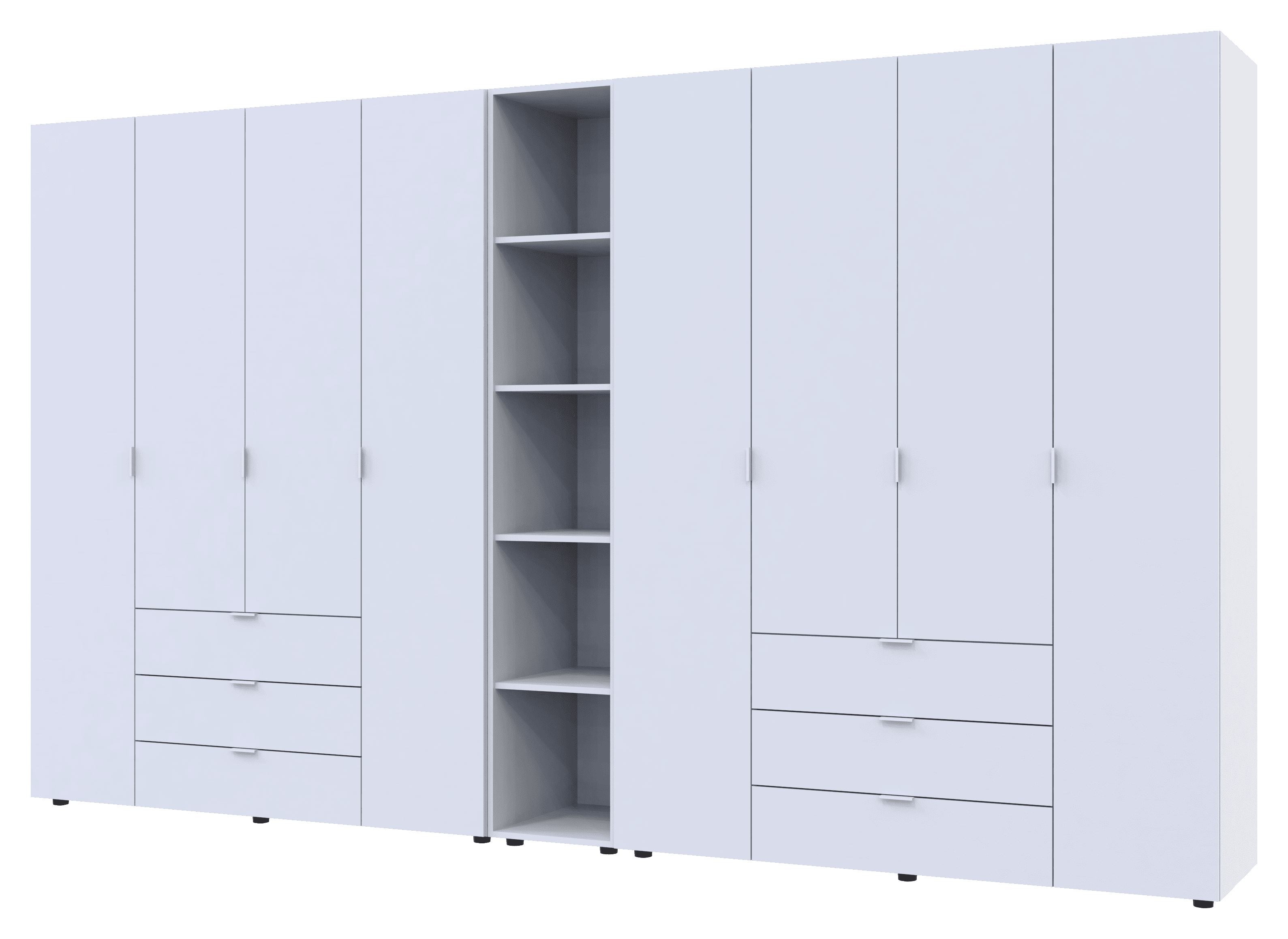 Шкаф Гелар восьмидверный с этажеркой Белый 349 см – это просторное и стильное решение для создания светлого и упорядоченного интерьера.