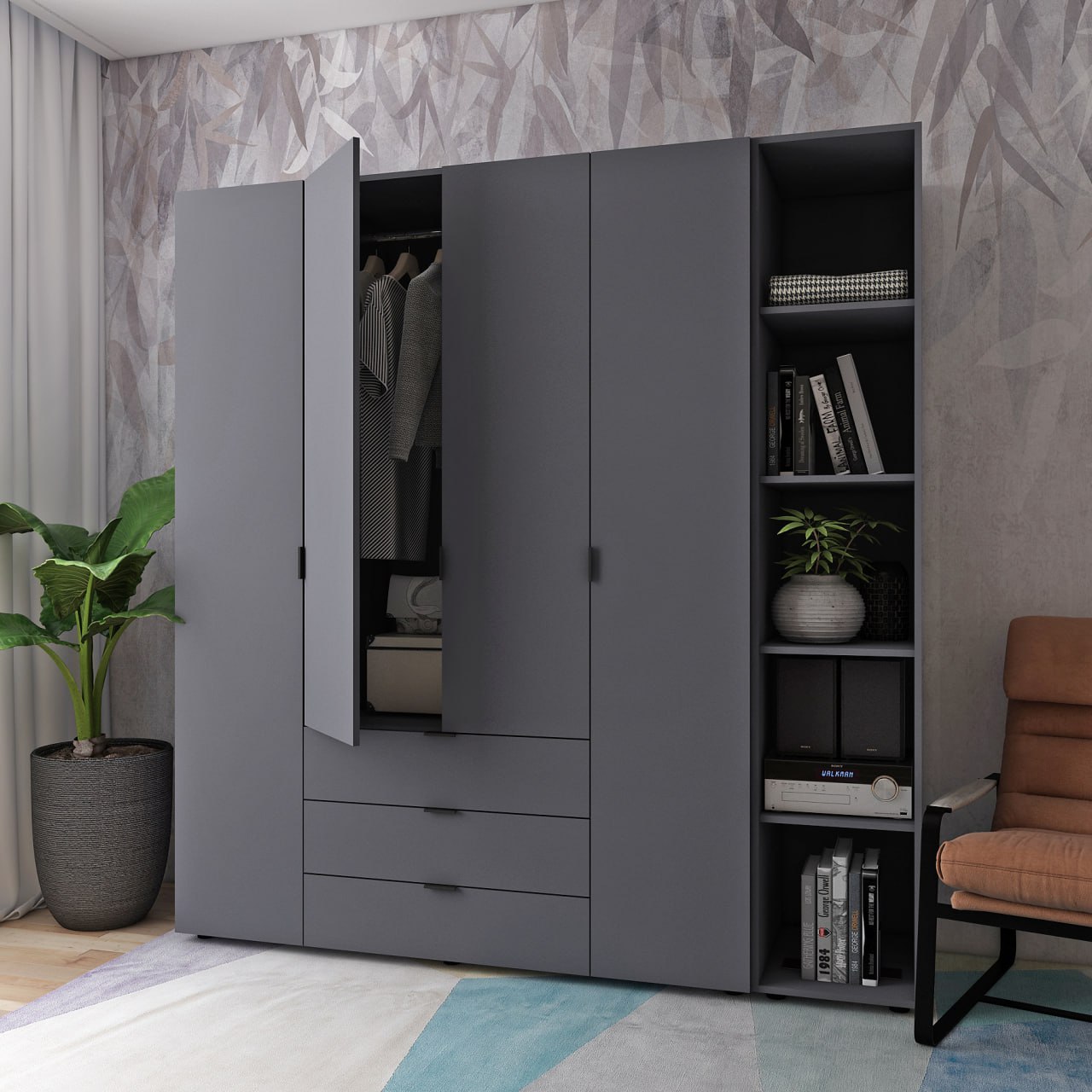Шкаф Гелар четырёхдверный с этажеркой Графит 193 см — стильное и вместительное решение для организации вашего пространства.