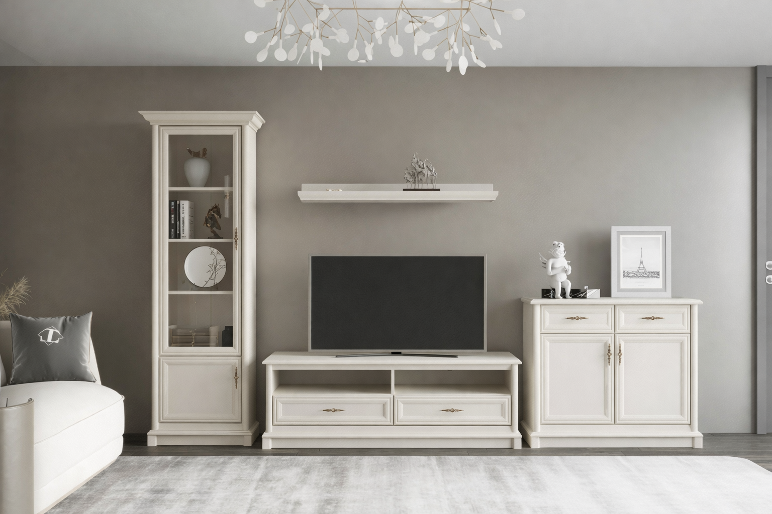 Стенка изготовлена из высококачественного ламинированного ДСП, которое отличается стойкостью к царапинам, влаге и ежедневным нагрузкам.Комплект состоит из витрины, ТВ тумбы, полки и комода, что позволяет максимально функционально использовать пространство возле телевизора, сохраняя эту зону аккуратной и визуально лёгкой.