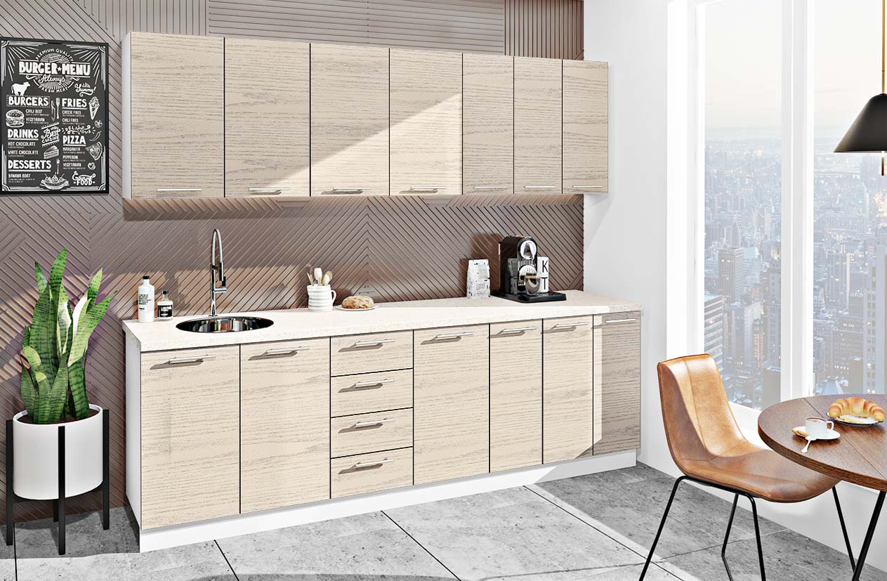 Кухонный комплект Эко 2,5 м – это современное решение для тех, кто ценит комфорт, практичность и стиль в каждой детали. Благодаря продуманной модульной системе вы можете подобрать оптимальное сочетание элементов под любое пространство и планировку. Наши менеджеры помогут создать максимально удобную и функциональную конфигурацию с учетом всех ваших потребностей.В комплектации предусмотрены разнообразные элементы: кухонные шкафчики и пеналы, тумбы с выдвижными ящиками или распашными фасадами, секции для хранения, антресоли, бутылочницы, мойные тумбы и шкафы под встроенную технику. Также возможно интегрирование посудомоечной или стиральной машины, которые органично встраиваются в фасады, сохраняя целостность дизайна и эргономику пространства.Благодаря широкому выбору модулей Эко 2,5 м позволяет создать индивидуальный комплект, который сочетает функциональность, эстетику и рациональное использование площади. Это стильное и современное решение, которое подарит вашему дому атмосферу уюта и природной гармонии.