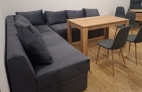 - Плюсы прямого дивана: нет стыка на спальном месте, занимает меньше места в комнате и лучше подходит для малых и средних комнат, а также приятная цена.