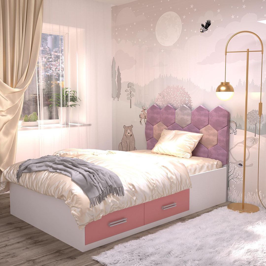 Эта стильная кровать предназначена для детей и подростков. Вы можете выбрать цвет ткани для спинки и орнамент из нашего каталога, чтобы кровать идеально вписалась в интерьер детской комнаты. Ящики расположены так, чтобы они не мешали друг другу и рядом с кроватью можно было поставить тумбочку.