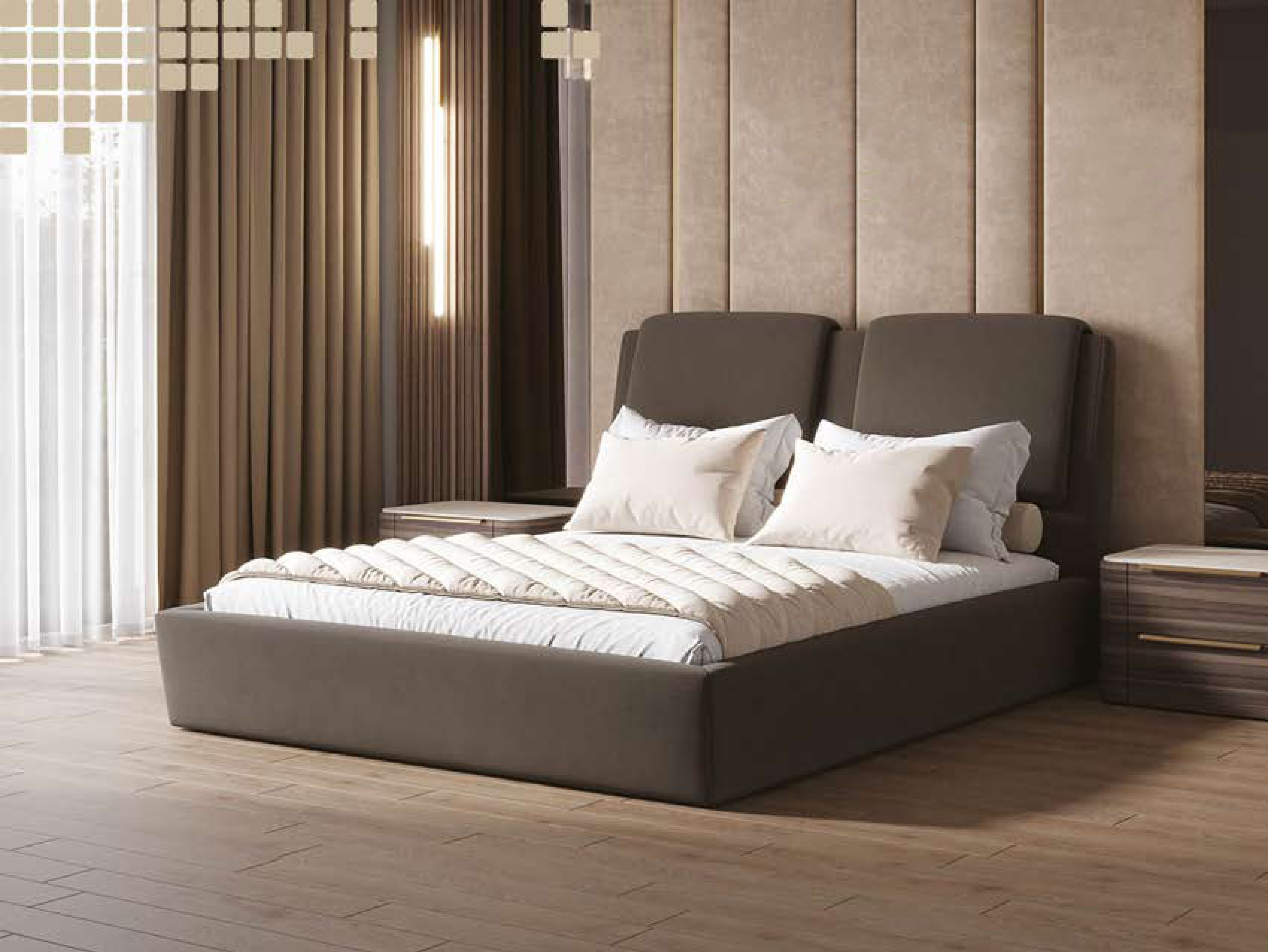 Эта дополнительная опция делает корпус кровати выше, а значит и спальное место приподнимается. Кровать выглядит более массивной и прочной, что особенно гармонично смотрится в комнатах с высокими потолками. Учтите, что из-за большей высоты садиться и вставать с кровати будет иначе.