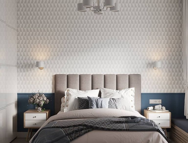 - Уникальное изголовье. Сегментированная форма придает интерьеру изысканность.