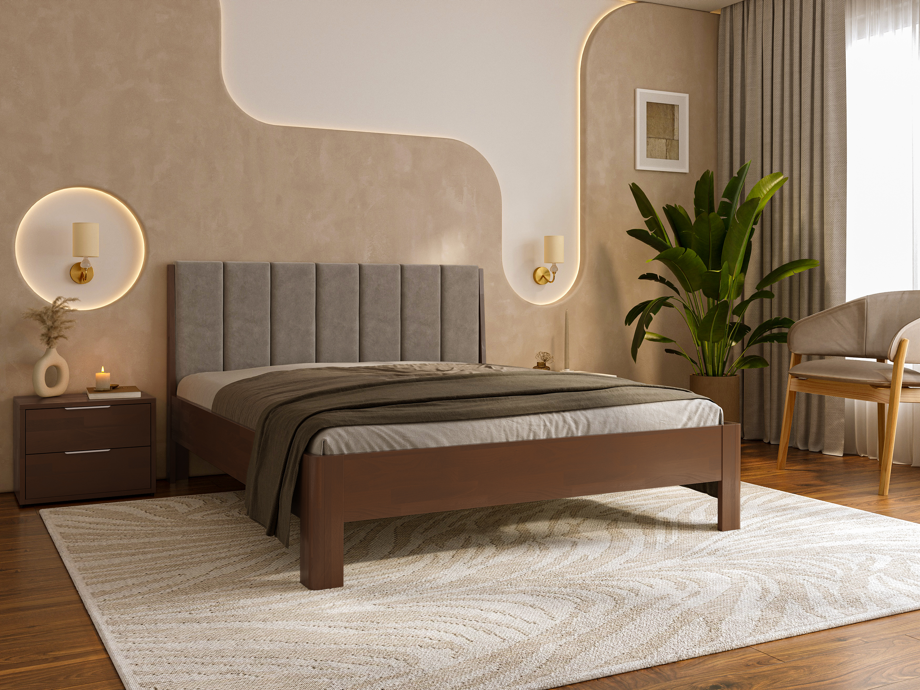 Кровать Модерн — это стильная интерпретация современного дизайна с акцентом на геометрию, комфорт и практичность. Его лаконичное изголовье с равномерной прострочкой выглядит стильно и сдержано, идеально вписываясь в минималистичные или скандинавские интерьеры. Благодаря мягкой обивке по всему периметру, модель не только приятна на ощупь, но и добавляет ощущение уюта.