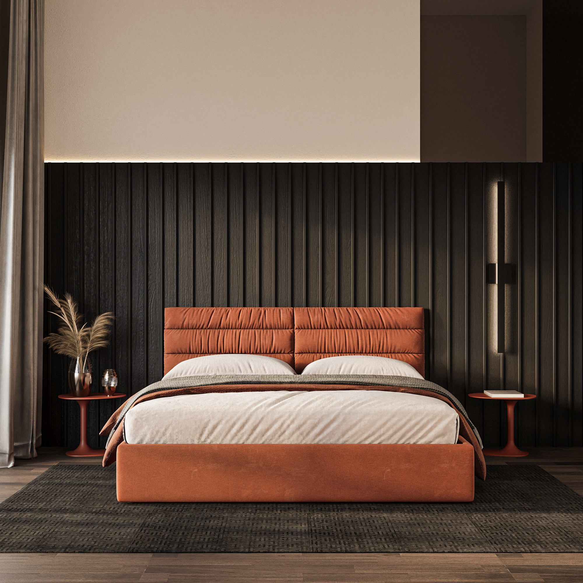 Обивка изголовья основной тканью будет особенно полезна, если вы планируете поставить кровать так, чтобы спинка полностью или частично оставалась на виду в комнате.
