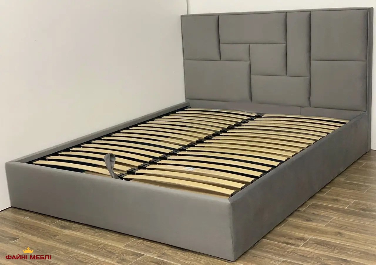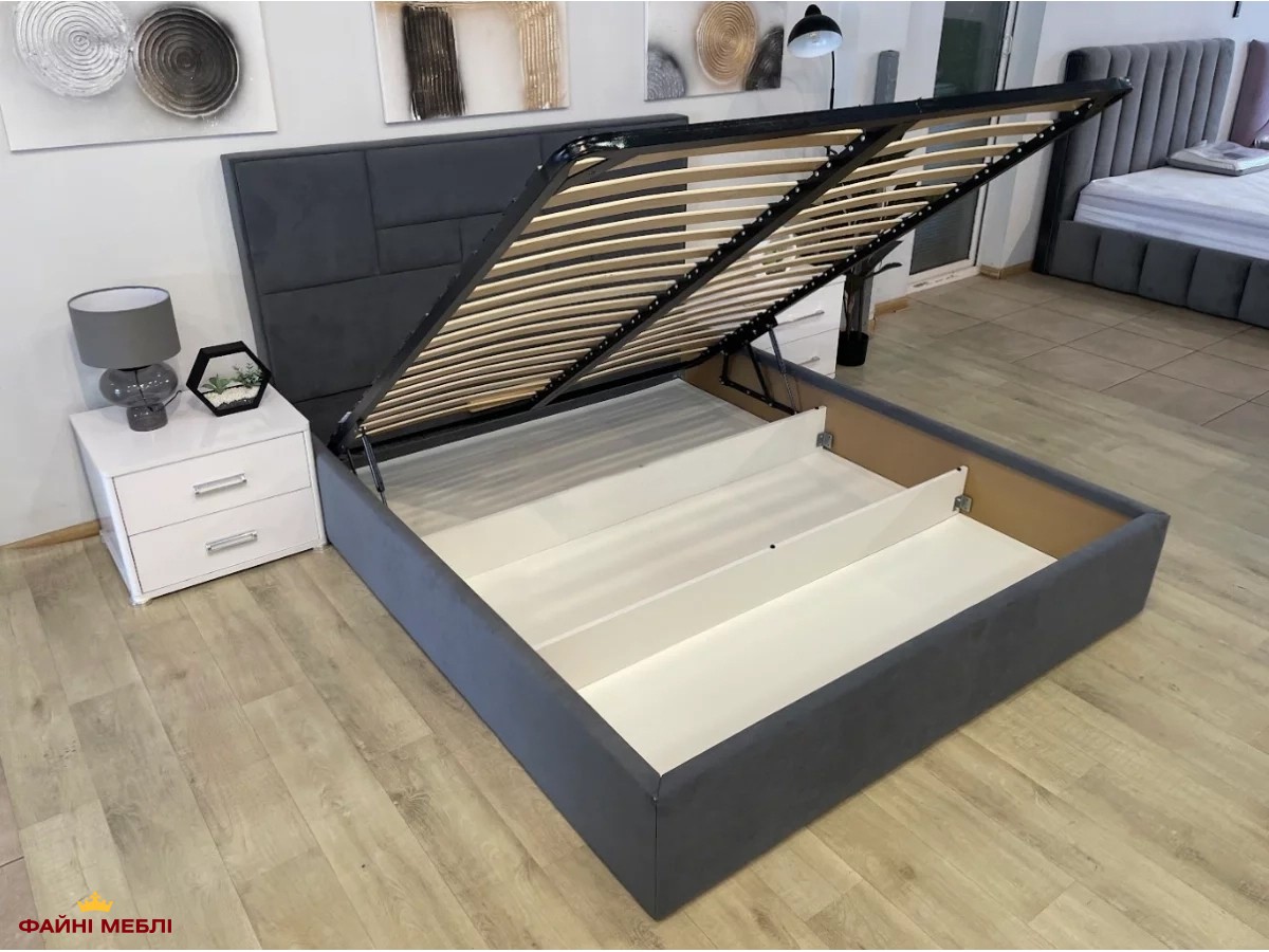 - Функциональный вариант с подъемным механизмом. Каркас легко поднимается благодаря газовым амортизаторам (750–1200 N), открывая доступ к просторной нише для вещей. Дно – шлифованное МДФ, перемычка – ДСП, нагрузка – до 120 кг.