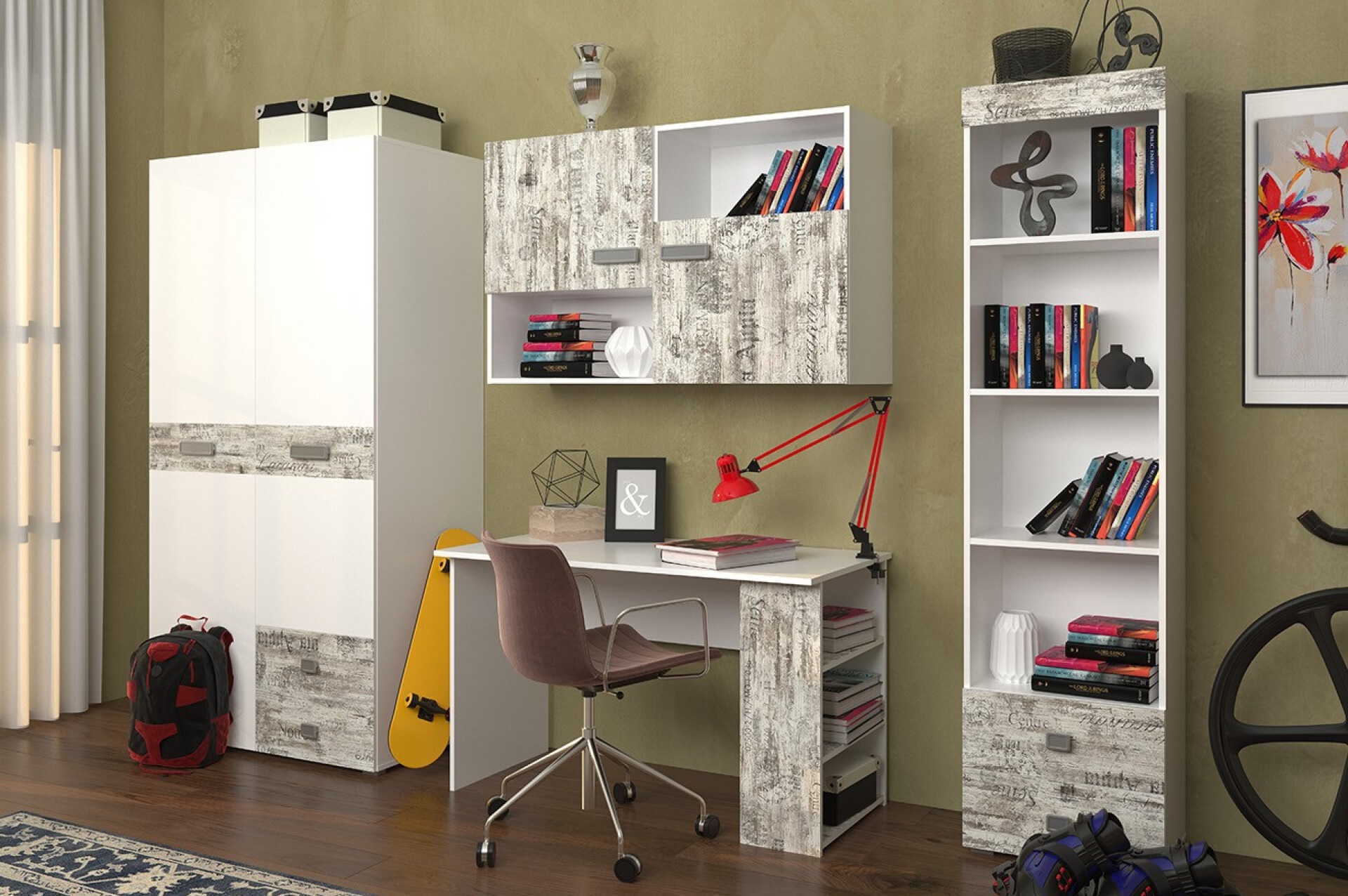 Модульная детская Памп изготовлена из надёжного ЛДСП в корпусе и фасадах, что обеспечивает долговечность и простоту ухода, а пластиковые ручки делают использование безопасным и комфортным. Телескопические направляющие полного выдвижения гарантируют плавное движение ящиков для удобного ежедневного использования. Коллекция представлена в современном цвете Белый/Кантри Лейбл, который добавляет комнате света и уюта. В комплектацию входят комод, кровать, письменный стол, навесной шкаф и прикроватная тумба — всё необходимое для учёбы, отдыха и хранения вещей в детской комнате.