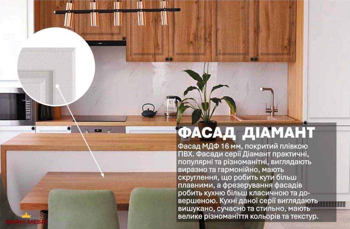 Модульная кухня Диамант удобна и стильна, сочетает современный дизайн и продуманную функциональность, создавая комфортное пространство для повседневного использования. Благодаря модульной системе вы сможете выбрать оптимальное сочетание элементов под любое планирование, а эргономичные размеры тумб и столешниц обеспечивают комфорт во время приготовления. Фасады с ручкой добавляют кухне практичности и изысканного вида, а натуральные оттенки и широкий выбор материалов делают её универсальным решением для любого интерьера. Минималистичная, в то же время функциональная, кухня Диамант станет современным акцентом вашего дома, сочетая эстетику и удобство в каждой детали.