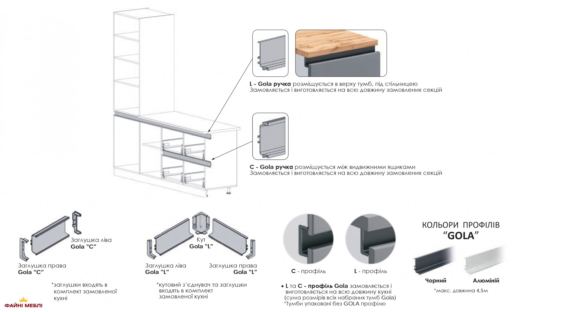 - Цокольный плинтус. Нижние секции оборудованы плинтусом из ДСП в тон корпуса. При необходимости вы можете заказать сплошной плинтус из ДСП или МДФ длиной кухни.