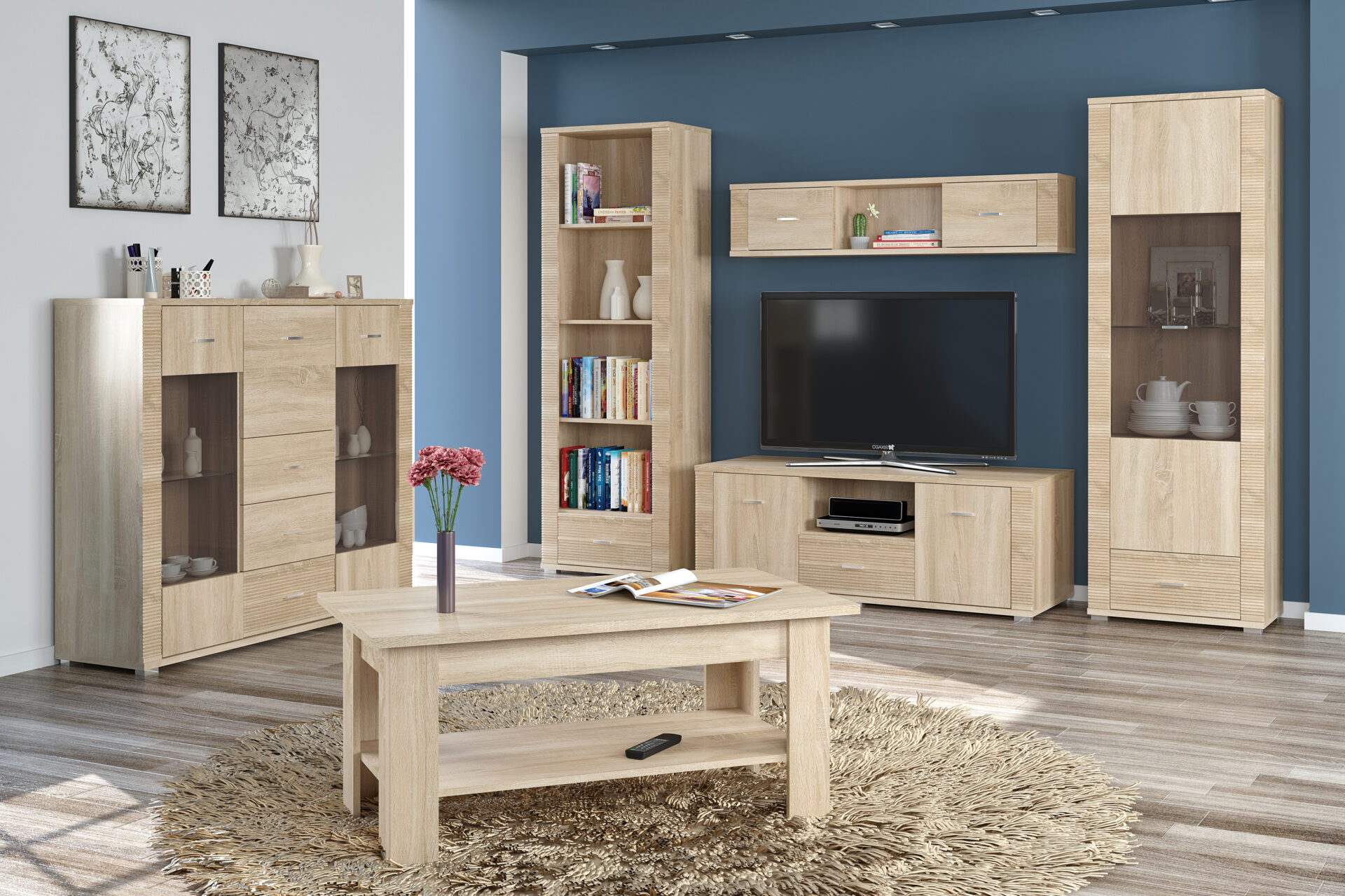 Модули комплекта могут включать ТВ тумба, полка навесная, комод, витрины — вы сами выбираете конфигурацию вашего пространства.