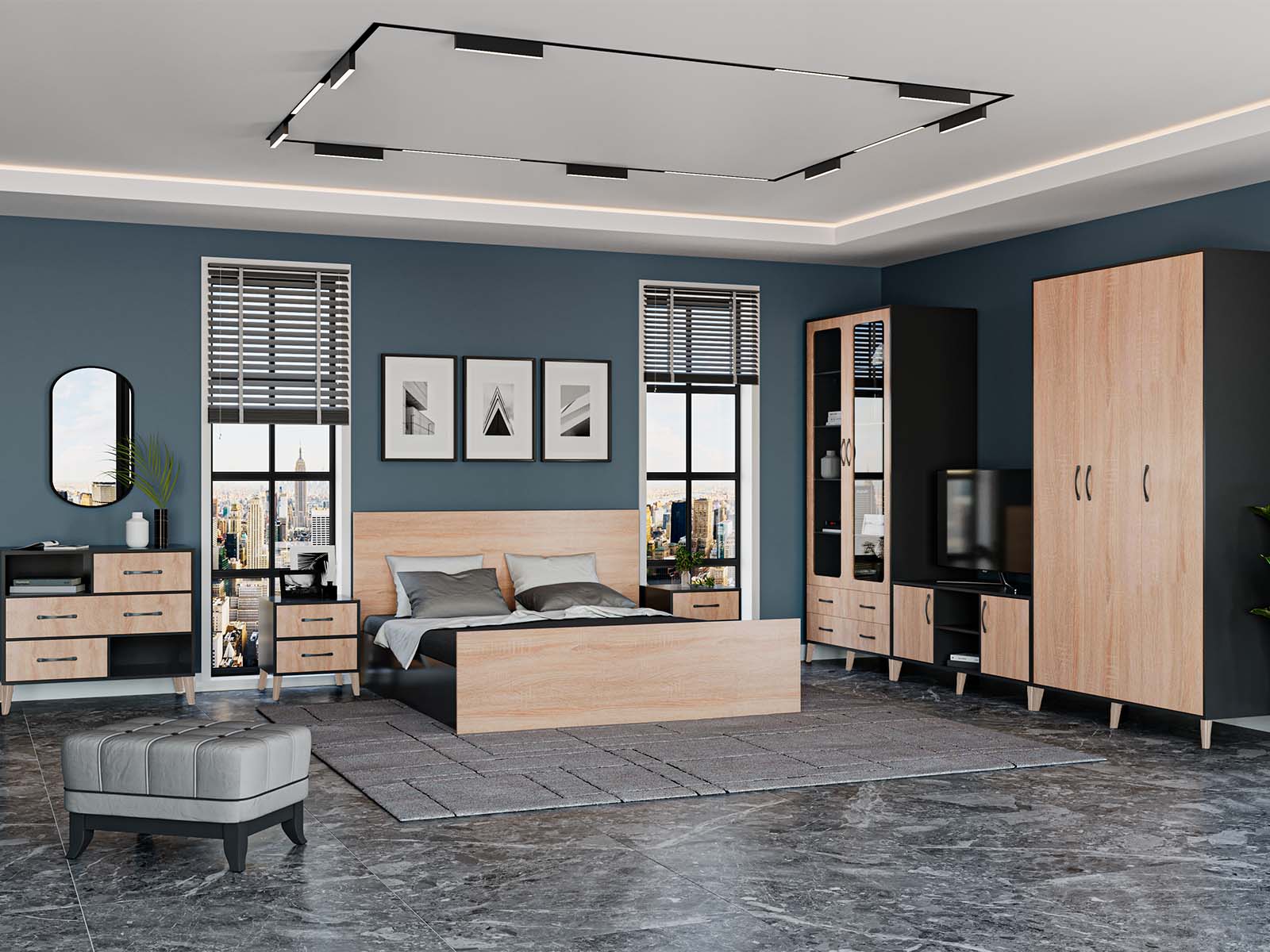 Модульная спальня Фокс в цветах Антрацит и Дуб Сонома создана для тех, кто ценит современный дизайн, сдержанную элегантность и практичность в каждой детали. Контрастные оттенки и прямые линии придают комнате характер, а гармоничное сочетание темного и светлого дерева делает интерьер одновременно уютным и современным. Благодаря продуманной модульной системе вы легко подберете оптимальную композицию под размер вашей спальни и личные потребности. Каждый элемент создан для ежедневного комфорта: от мест для хранения до функциональных деталей, которые помогают поддерживать порядок без лишних усилий. Фокс сочетает стиль, удобство и функциональность, делая спальню настоящим сердцем дома.