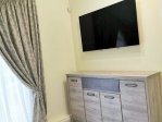 Шкафы, полки, кровать, комод, стол и тумба создают полноценное пространство для отдыха, работы и хранения вещей.