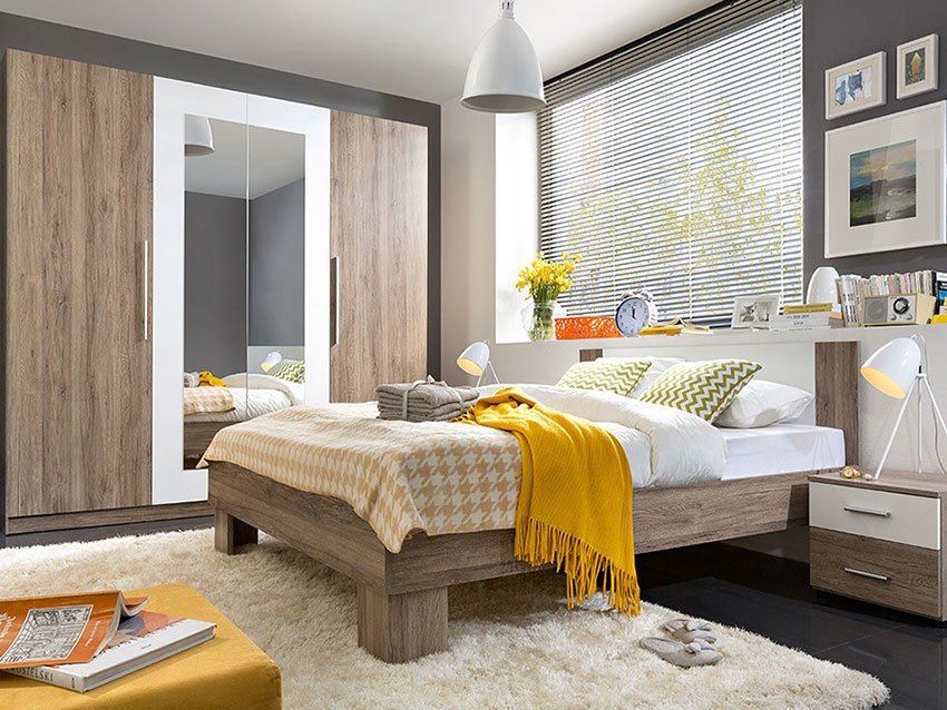 Кровать, шкаф и прикроватная тумба обеспечивают всё необходимое для организации спальни без лишних деталей.