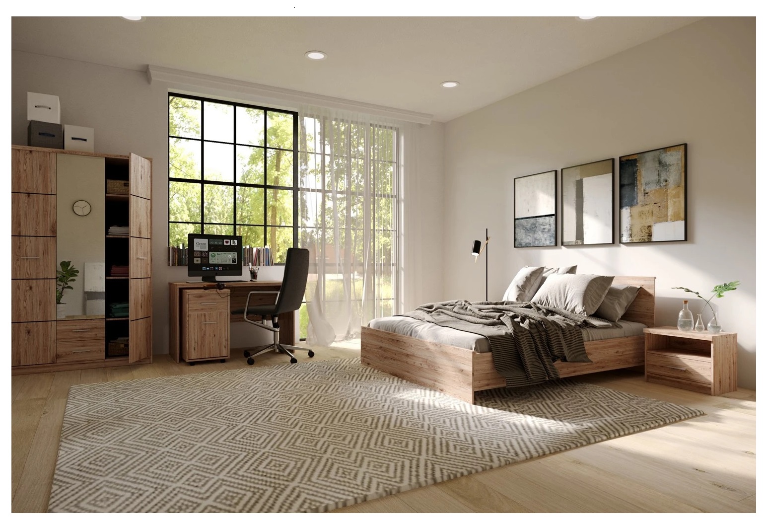 Шесть элементов позволяют собрать полноценную спальню и оставить много свободного места. - Светлый дуб "освещает" комнату