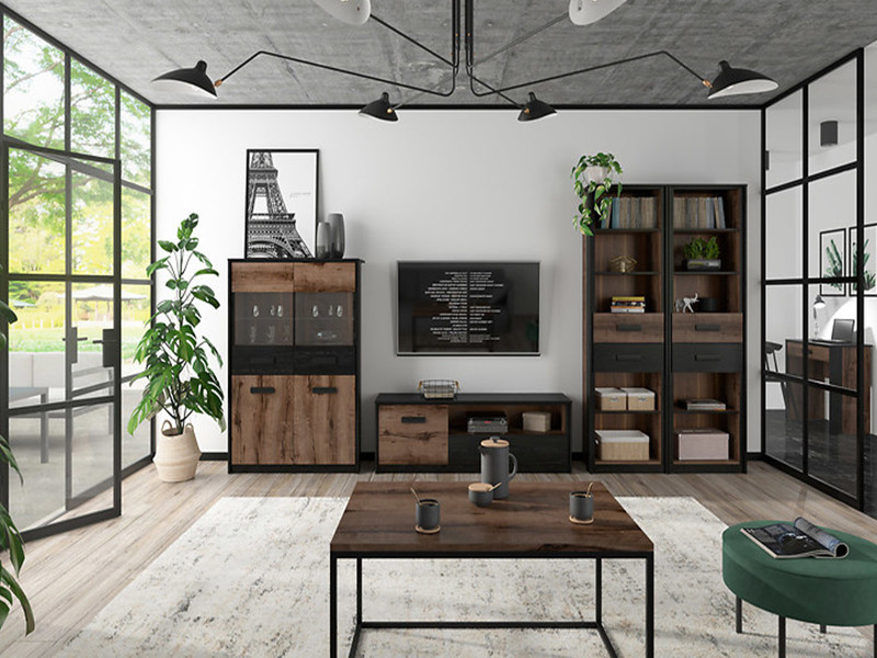 Модули комплекта могут включать тумбу под телевизор, шкаф, стеллажы, витрины, полка — вы сами выбираете конфигурацию вашего пространства.