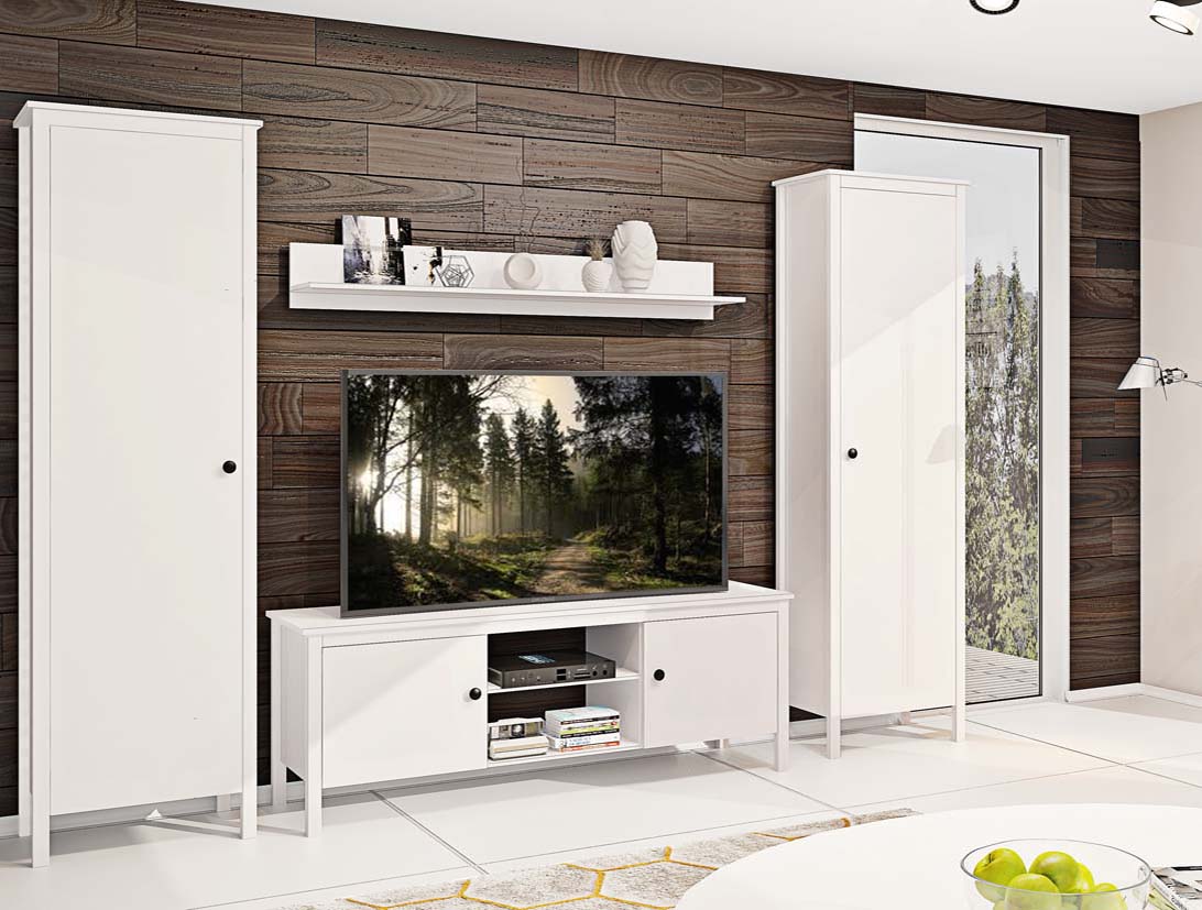 Модули комплекта могут включать тумбу под телевизор, шкаф навесной, навесные полки, шкаф — вы сами выбираете конфигурацию вашего пространства.