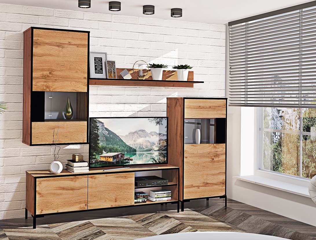 Модули комплекта могут включать тумбу под телевизор, шкаф навесной, навесные полки, шкаф — вы сами выбираете конфигурацию вашего пространства.