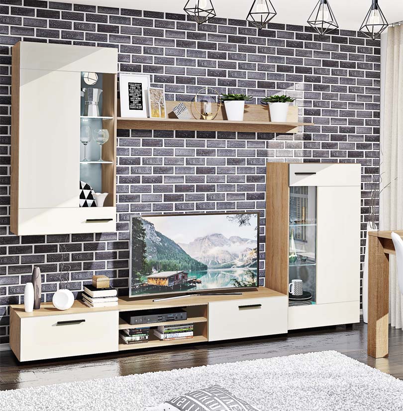 Модули комплекта могут включать тумбу под телевизор, шкаф навесной, навесные полки, шкаф — вы сами выбираете конфигурацию вашего пространства.