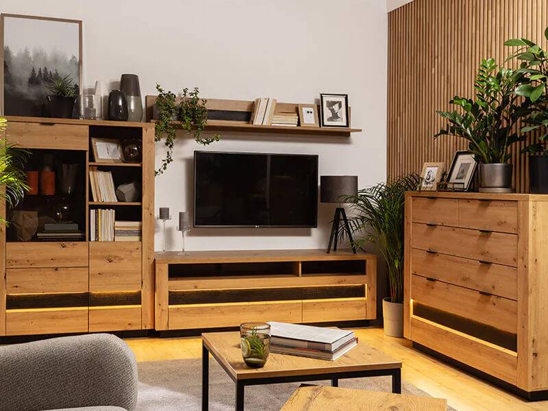 Модули комплекта могут включать тумбу под телевизор, комод, шкаф, витрины, полка, журнальный стол, буфет — вы сами выбираете конфигурацию вашего пространства.