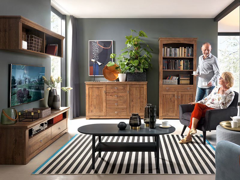 Модули комплекта могут включать тумбу под телевизор, шкафы, витрины, полка, журнальный стол, комоды — вы сами выбираете конфигурацию вашего пространства.