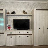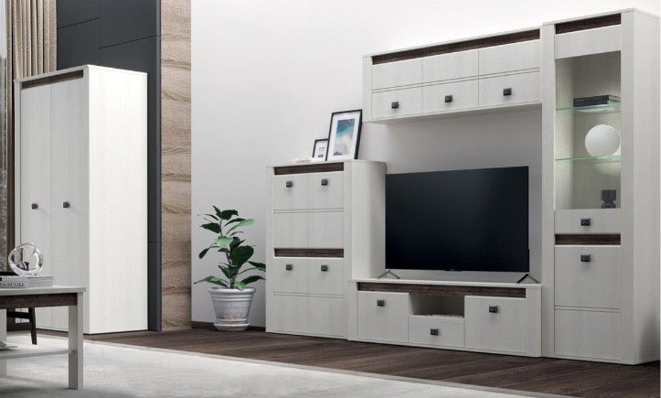 Модули комплекта могут включать шкаф, тумбы, комод, журнальный стол, полка, ТВ тумба, витрина — вы сами выбираете конфигурацию вашего пространства.