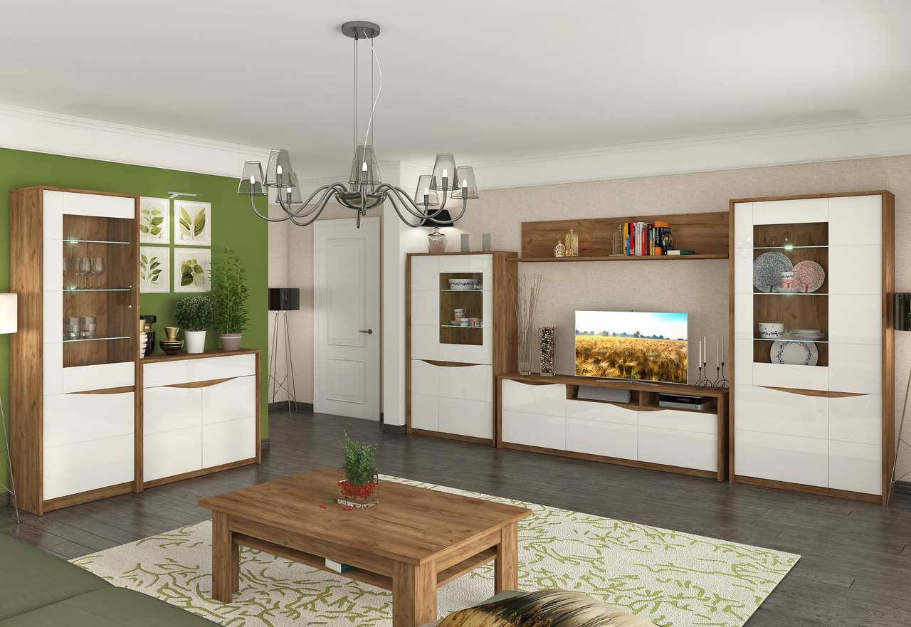 Модули комплекта могут включать шкаф, ТВ тумбу, журнальный стол, полка, пеналы, комоды — вы сами выбираете конфигурацию вашего пространства.