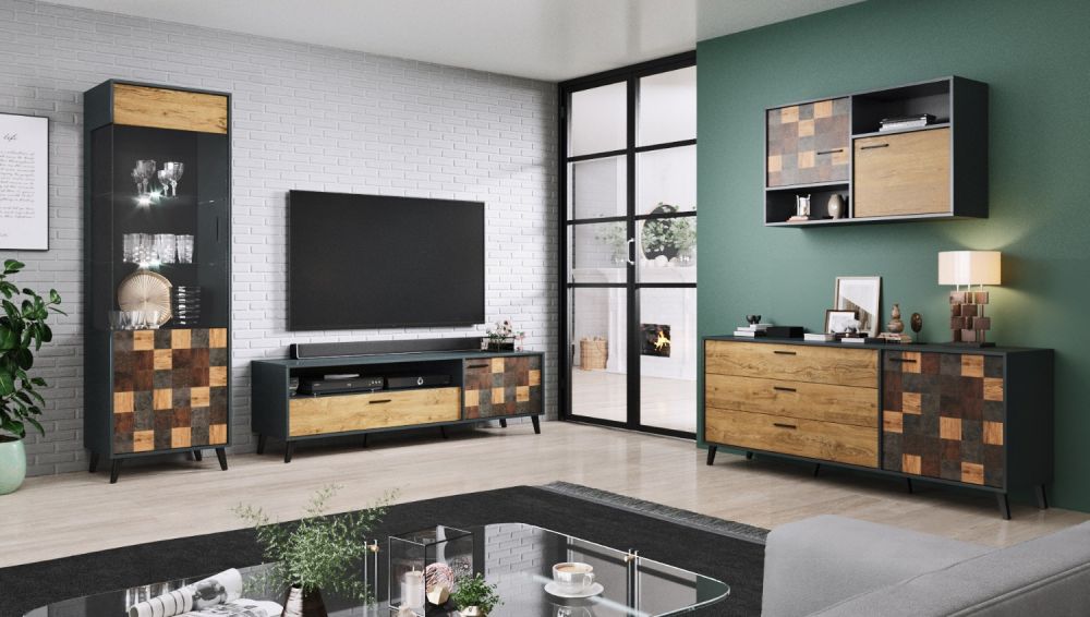 Широкий выбор модулей позволяет создавать индивидуальные композиции: от компактных решений до масштабных систем хранения. Благодаря разнообразию элементов коллекцию можно адаптировать к любому размеру комнаты и стилю интерьера. - Сдержанный современный стиль. Цвет антрацит с текстурой декора, прямые формы и деревянные акценты создают эстетику минимализма с характером.