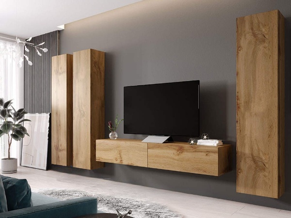 Модули комплекта могут включать тумбу под телевизор, шкафы, витрины, полка, журнальный стол, комоды — вы сами выбираете конфигурацию вашего пространства.