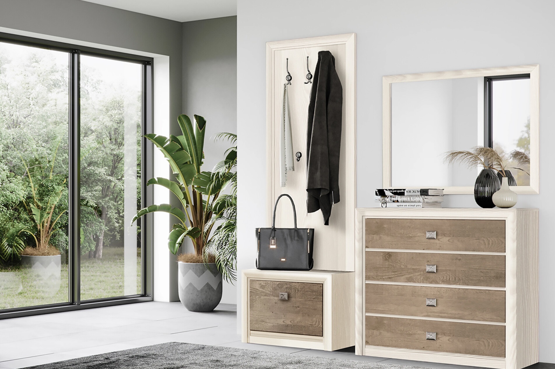 Модульная прихожая Коэн II изготовлена из ламинированной ДСП, которая обеспечивает прочность конструкции, устойчивость к износу и лёгкость в уходе. Фасады из ламинированной ДСП, дополненные рамками из МДФ, придают мебели выразительность и подчёркивают классический характер коллекции. Декоративные МДФ-планки по периметру модулей визуально смягчают массивные формы и добавляют дизайну завершённости. Для комфортного пользования применяются роликовые направляющие и петли Hettich, обеспечивающие надёжную и стабильную работу элементов. Стильные металлические ручки цвета античное золото с декоративным орнаментом гармонично дополняют общую эстетику. В состав модульной системы могут входить: две модели тумб для обуви, вешалка, тумба в двух модификациях, два зеркала разных размеров, три варианта шкафов, пенал, две витрины и два варианта комодов. Коллекция доступна в цветовых сочетаниях: Сосна каньон / Дуб тёмный хаки и Сосна каньон / Дуб корабельный. Комплект поставляется с инструкцией и полным набором фурнитуры для монтажа.