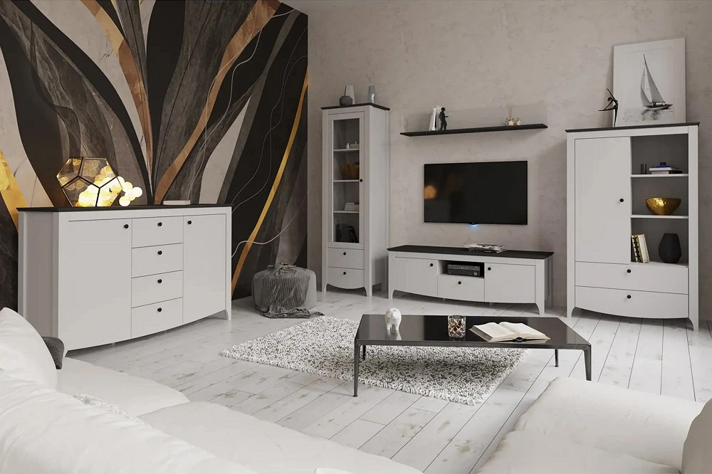 Модули комплекта могут включать витрина, комод, тумба, полка, тумба ТВ — вы сами выбираете конфигурацию вашего пространства.