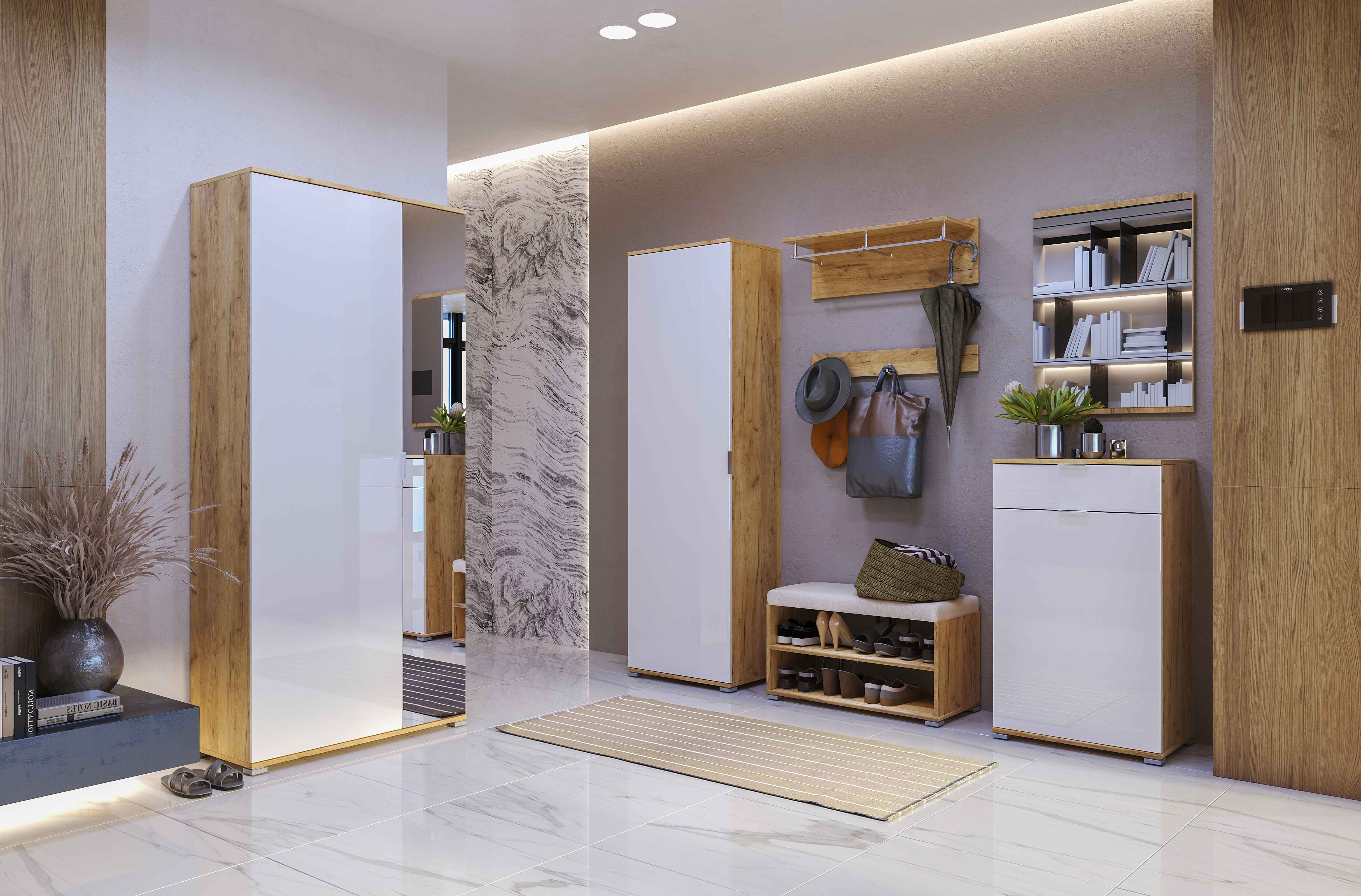 Модульная прихожая Миромарк Асти Дуб крафт / Белый глянец — современная гармония дерева и белого глянца