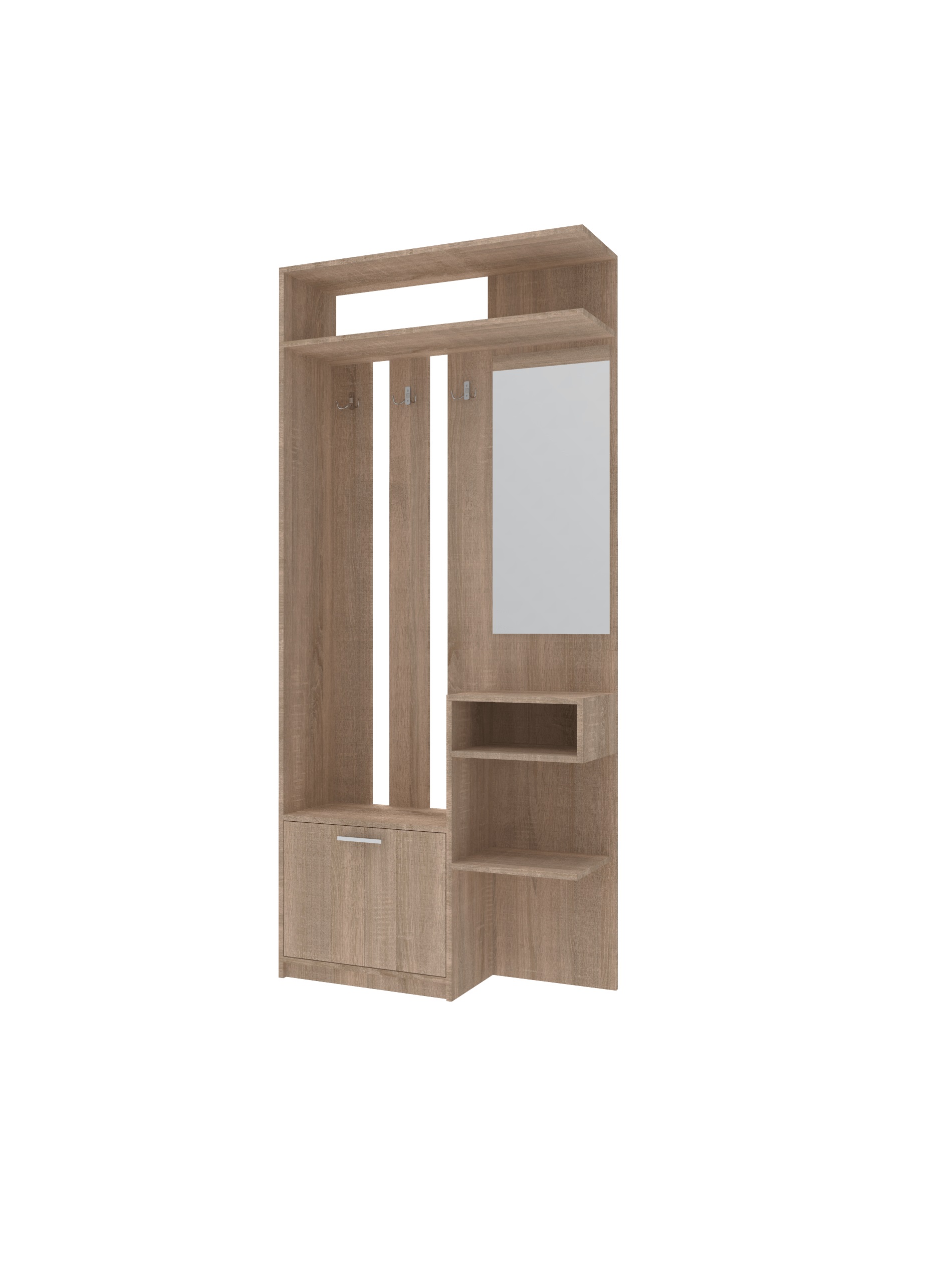Функциональная комплектация. Тумба для обуви, зеркало, вешалка, полка, а также дополнительная ниша и полка позволяют удобно хранить обувь, одежду и необходимые мелочи, поддерживая порядок в прихожей.