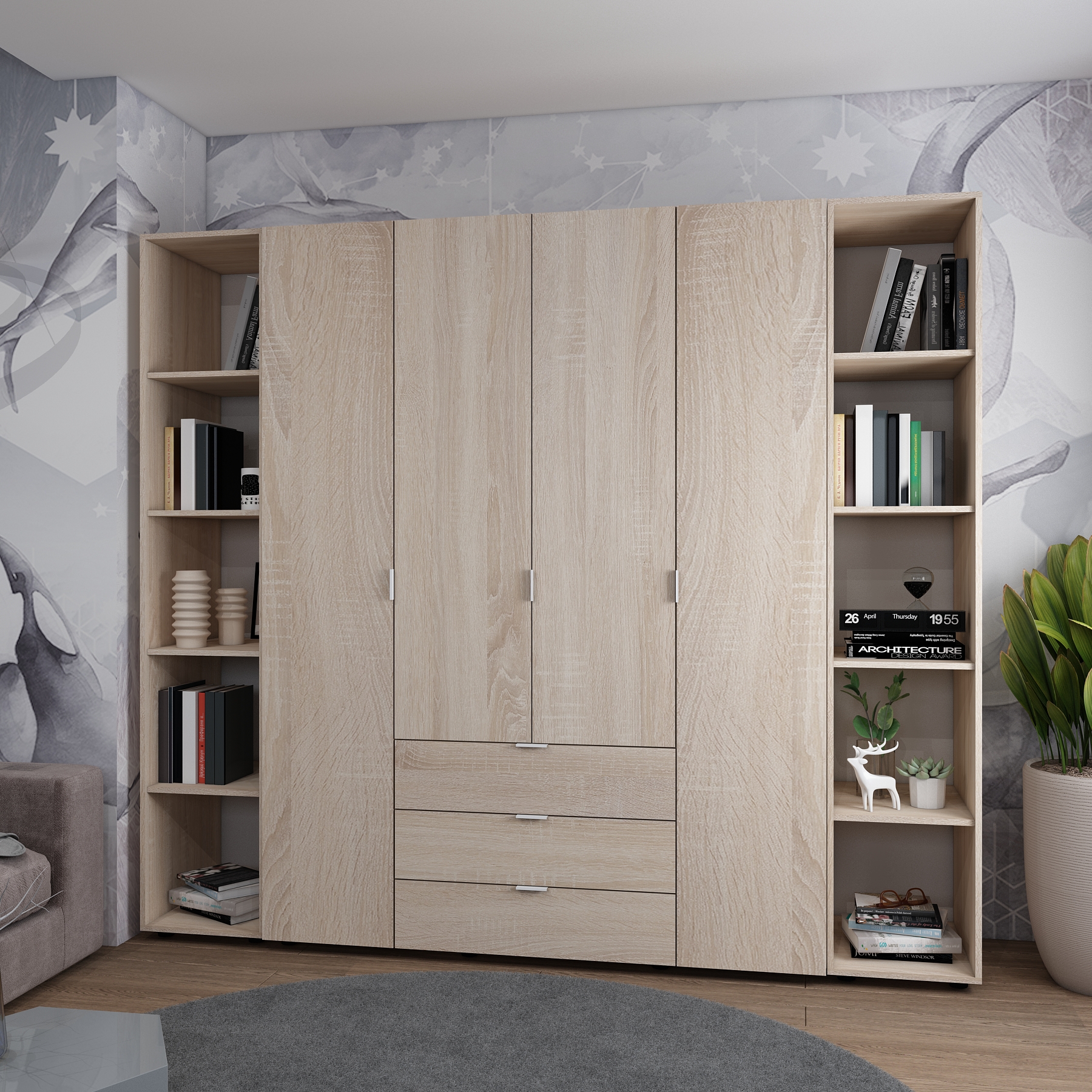 Шкаф Дорос Гелар дуб сонома с 2 Этажерками 4-х дверный 231,4 см