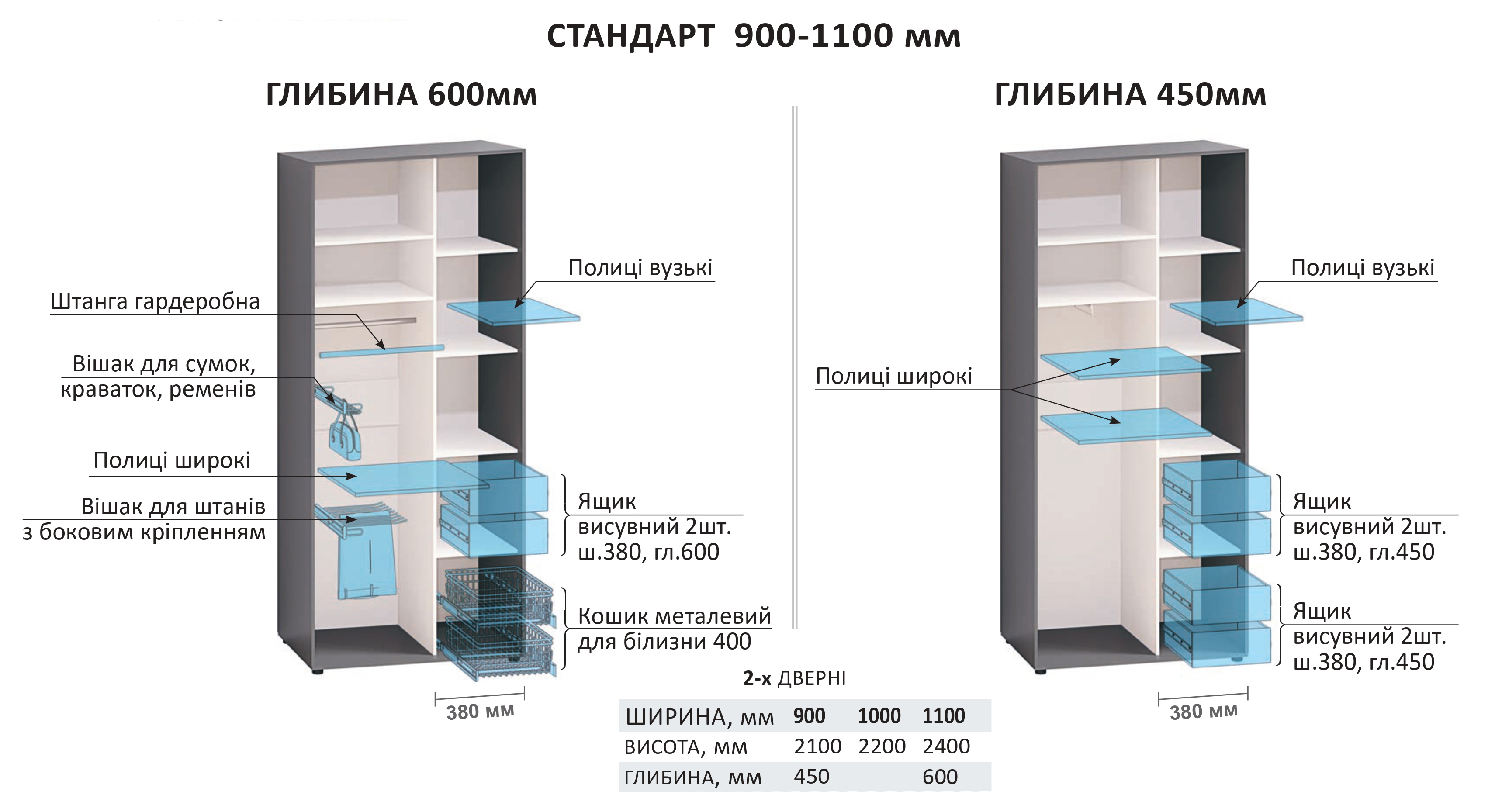 - Базовая комплектация — регулируемые ножки, пылезащитная щётка, дверной стопор, штанга труба — для глубины 60 см, выдвижная штанга — для глубины 45 см. Выдвижные ящики и другие дополнительные опции заказываются отдельно.
