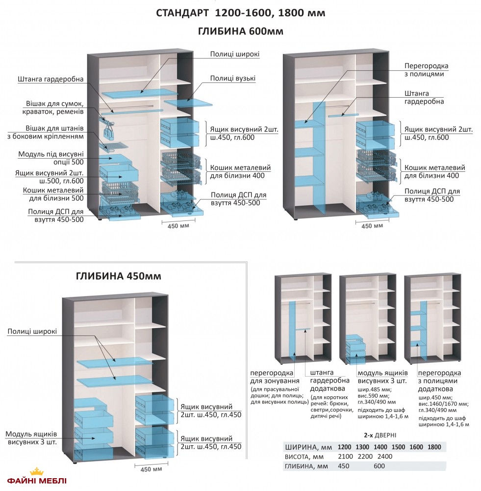 - Базовая комплектация — регулируемые ножки, пылезащитная щётка, дверной стопор, штанга труба — для глубины 60 см, выдвижная штанга — для глубины 45 см. Выдвижные ящики и другие дополнительные опции заказываются отдельно.