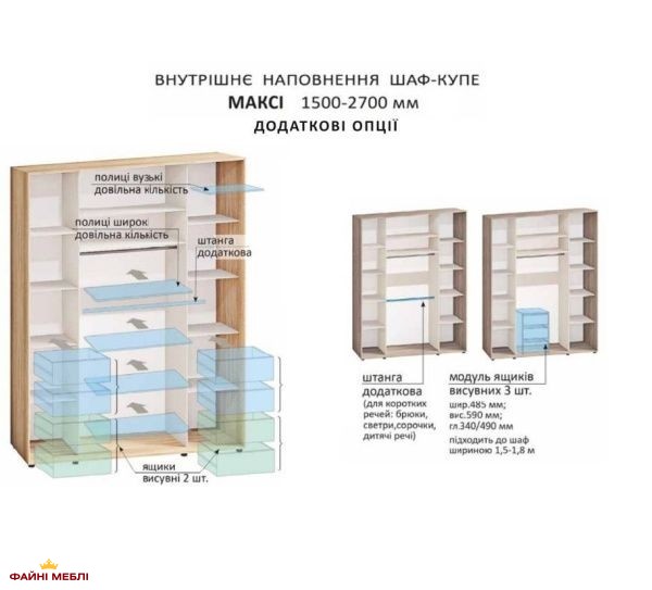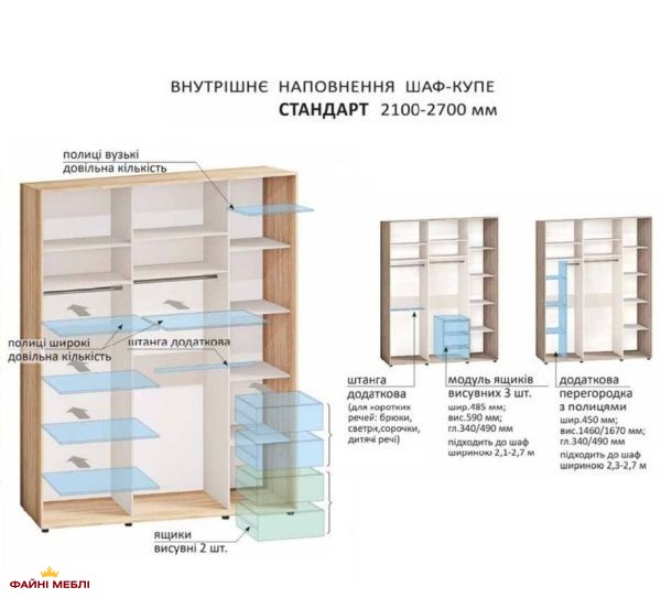 - Базовая комплектация — регулируемые ножки, пылезащитная щётка, дверной стопор, штанга труба — для глубины 60 см, выдвижная штанга — для глубины 45 см. Выдвижные ящики и другие дополнительные опции заказываются отдельно.