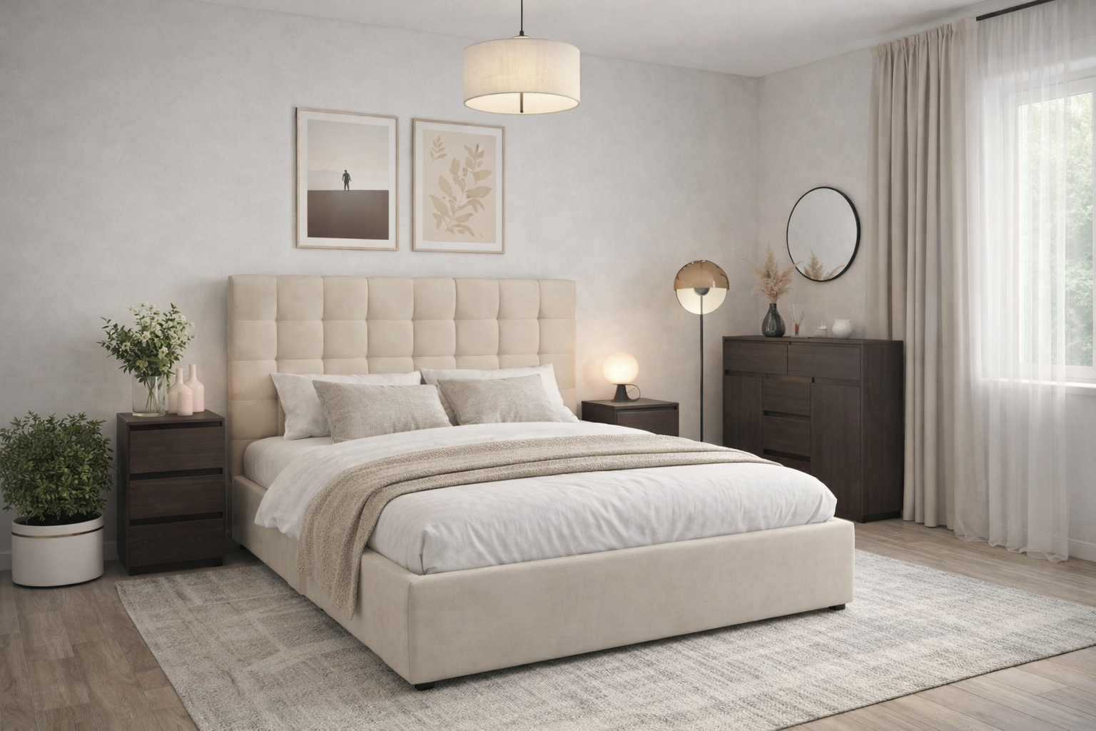 Комплект создаёт удобное и функциональное пространство: кровать дарит комфортный отдых и дополнительное место для хранения, тумба помогает держать необходимые мелочи под рукой, а комод позволяет организовать вещи и поддерживать порядок в спальне.